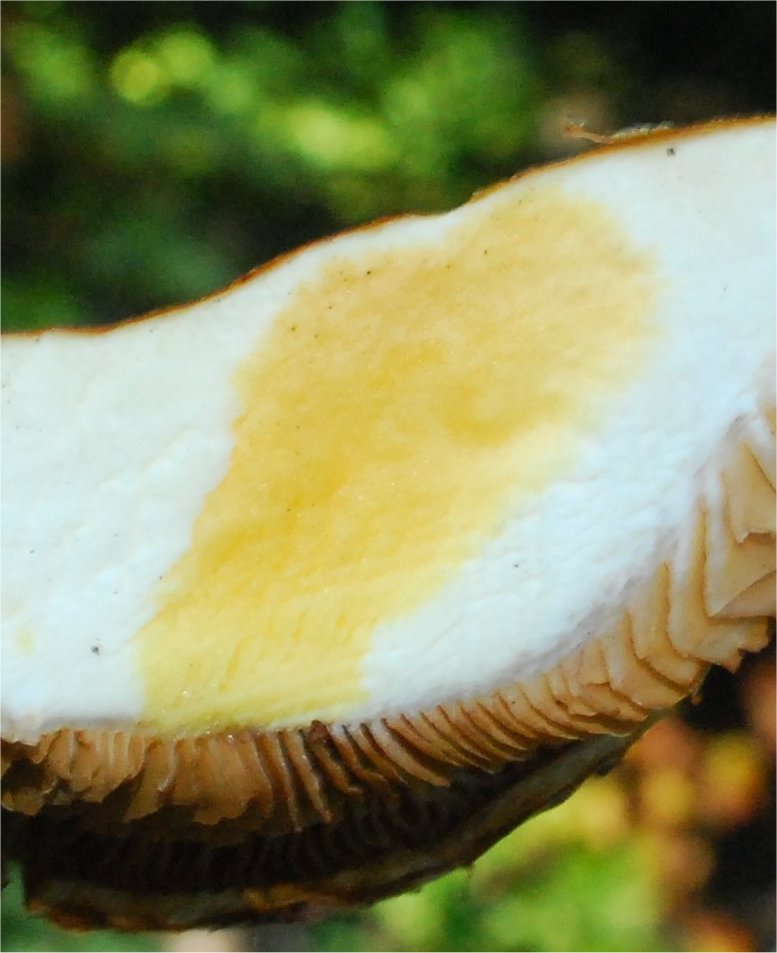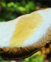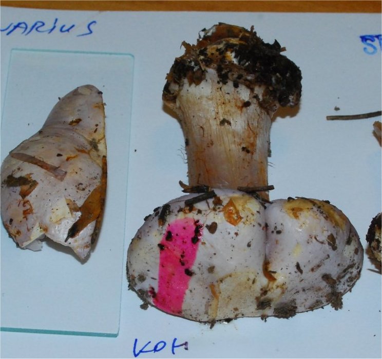 | MACROCHEMICAL TESTS Various macrochemical reactions are recorded for Cortinarius, but the color effects of KOH are critically important. This is particularly for the fleshy members of Subgenus Phlegmacium. The coloration falls into 4 main groups: None, Brown, Yellow or Pink/Red. Making a note of these, or pictures (far preferred) can immediately places the collection in the right Section and minimize a lot of cold Id effort. Please apply the KOH to the following surfaces:(1) Pileus (2) Context (3) Bulb (if present), (4) Mycelial strands (if present). |