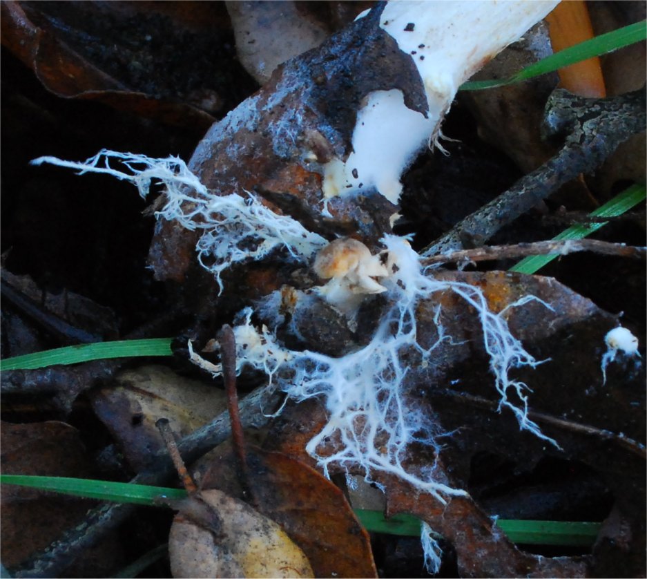 Copious mycelial strands at base of stem