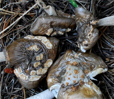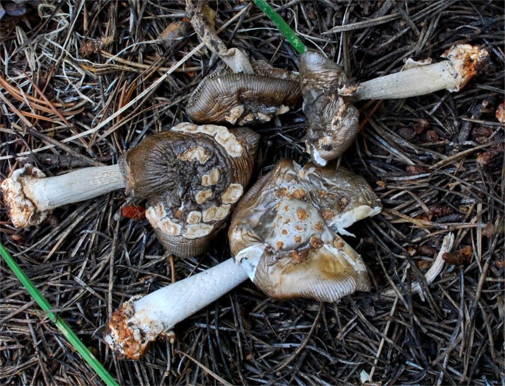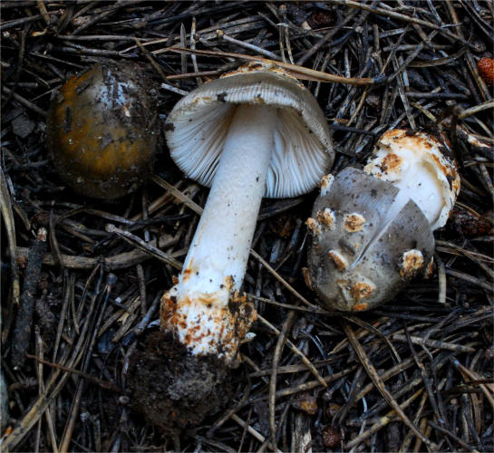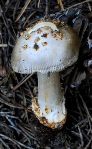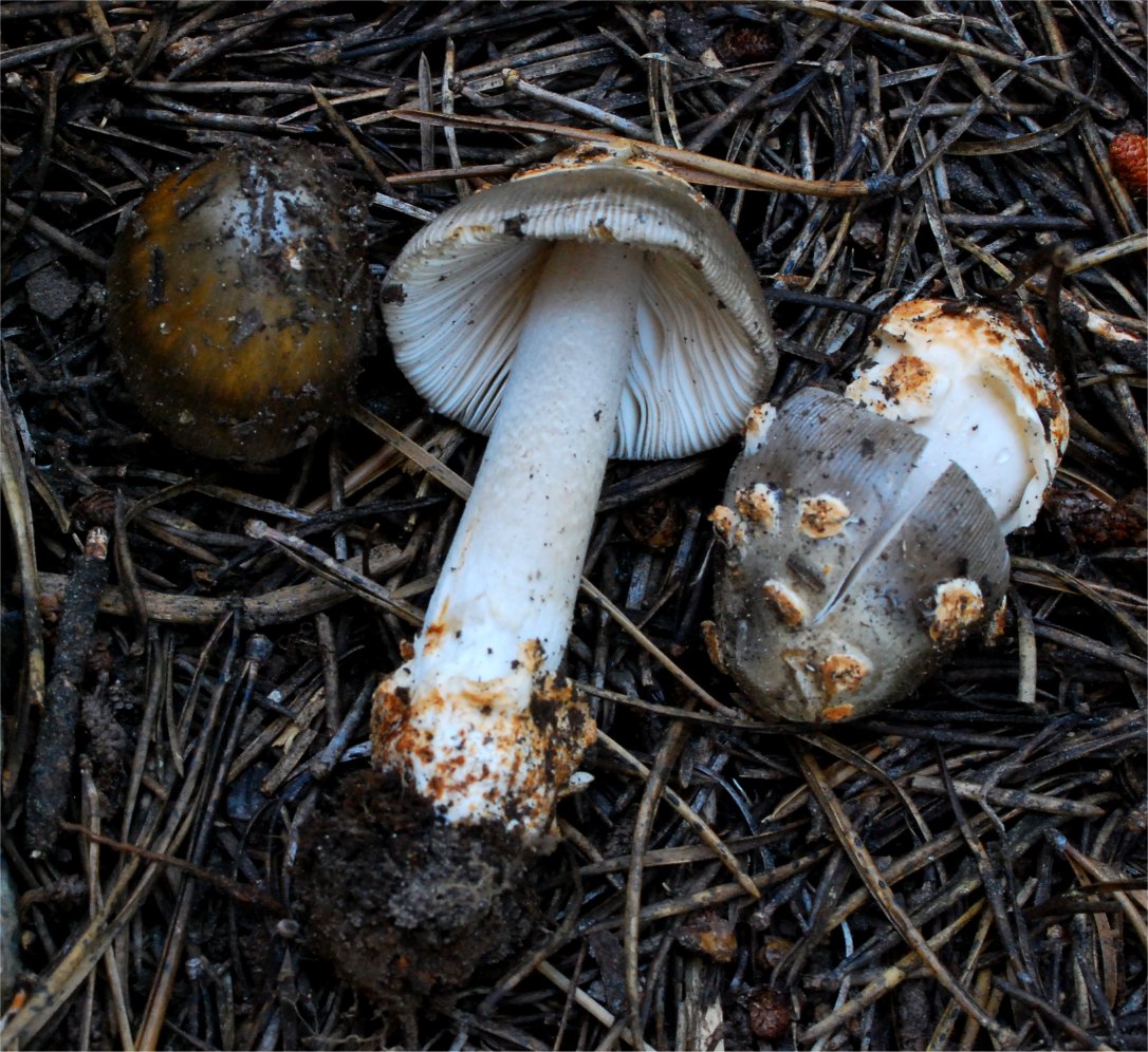 | This Amanita, Section Vaginatae occurs in the summer in the high elevations of Sierra Nevada (10,000 ft/3,000m) under Lodgepole pine. The browning tendencies of the universal veil are quite distinct. There is no taxon described from California that matches it. Very distant affinity can be drawn to Amanita protecta, but the habitat and other features separate them. |