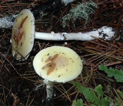 | The cluster of species around A. gemmata has not been fully studied yet in the Pacific Northwest. Therefore, collections need to be treated in a broad sense. The European literature lists many varieties and forms. The basic features of the Gemmatoid Amanitas are: (1) Yellowish pileal color overall ; (2) Collapsed or missing annulus at maturity; (3) Universal veil that typically leaves flatter and larger patches than A. pantherina; (4) Inamyloid spores of length 9-11µ and average Q-ratio of 1.3. (5) Unclamped basidia. There are numerous forms that tend to integrate with A. pantherina. | ||