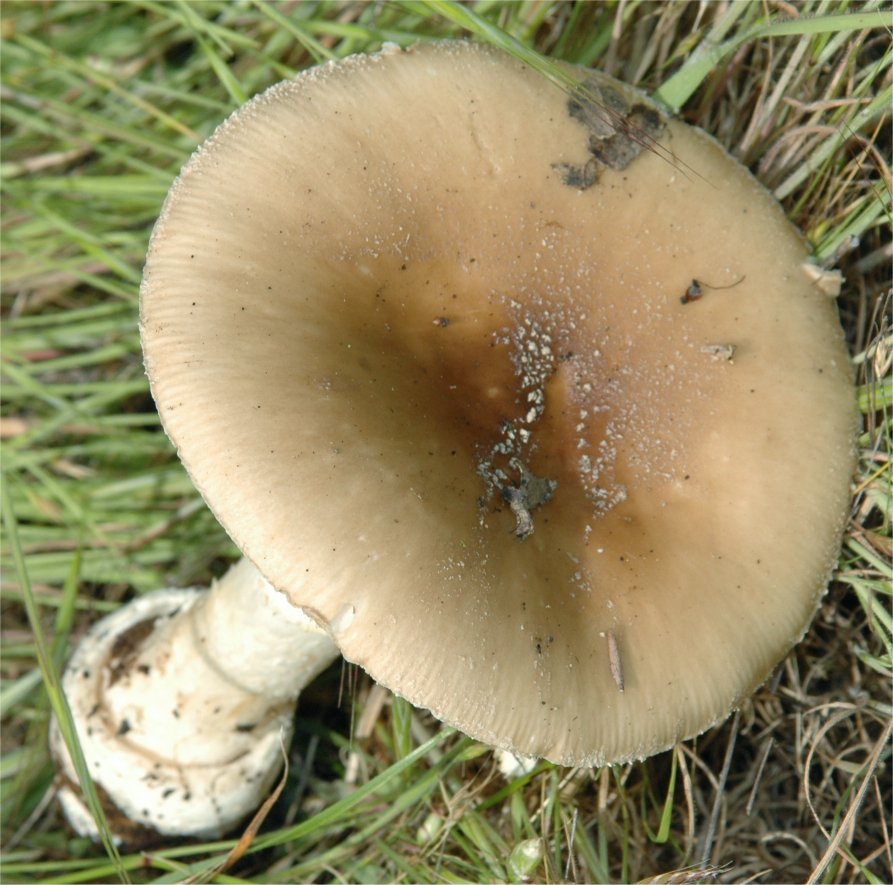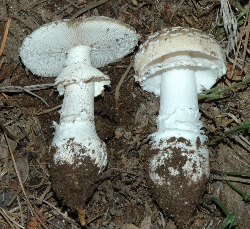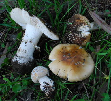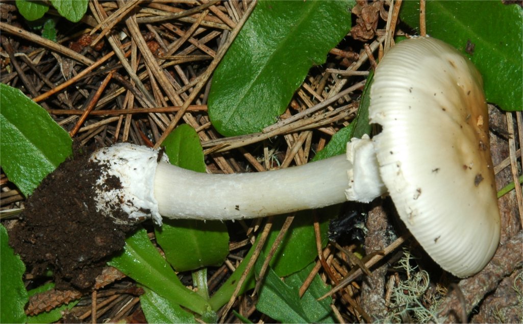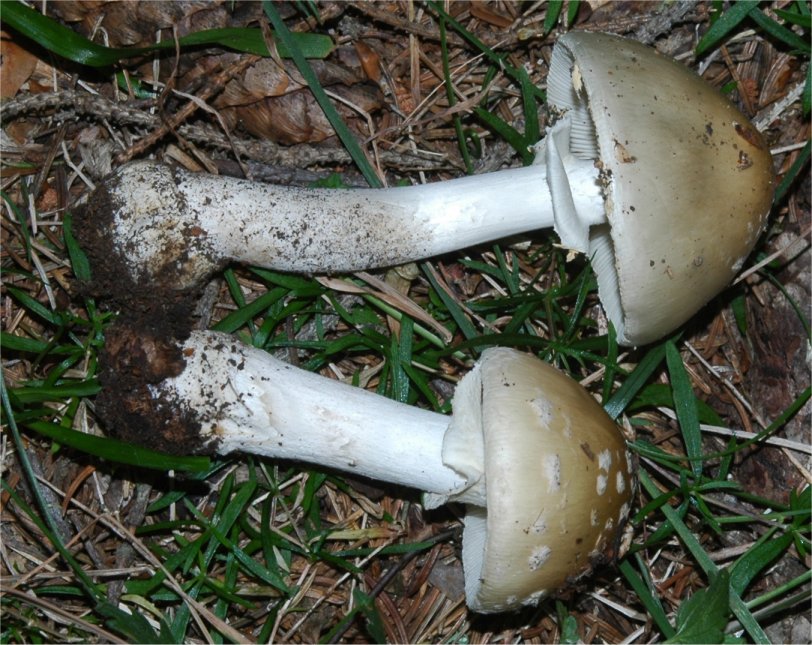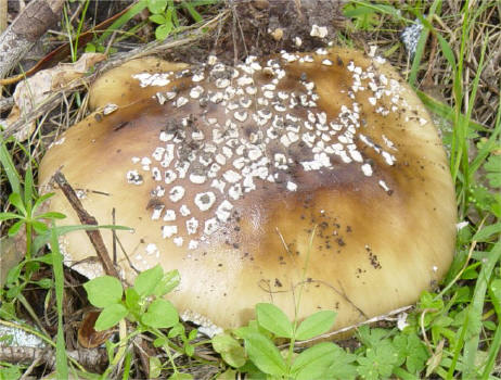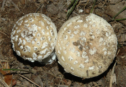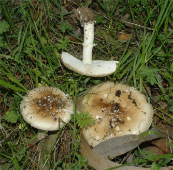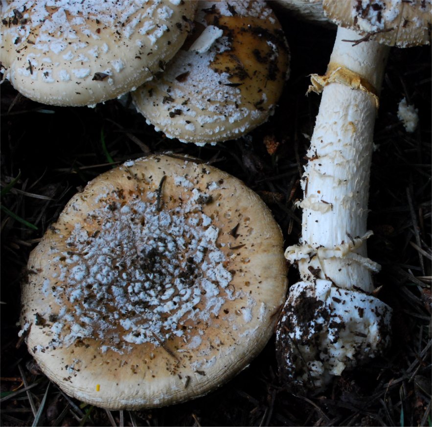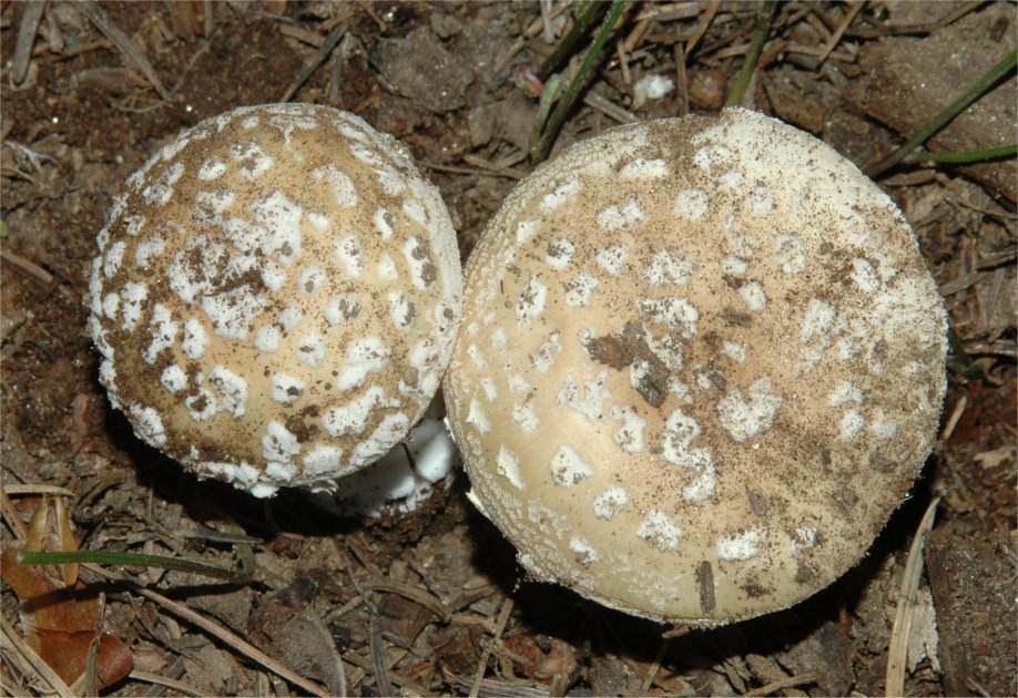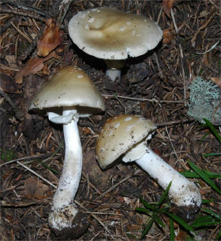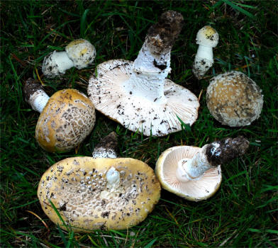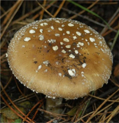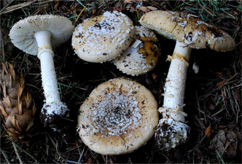 | The Panther Amanita is one of the classic mushrooms, renown for its beauty as well as significant toxicity. In the typical form -- darker pileus and small, pointed warts it is very easy to recognize. Yet, Amanita pantherina has many pale-capped forms that are hard to pinpoint and in many cases it has features that make it look closer to it's relative -- A. gemmata. | ||||