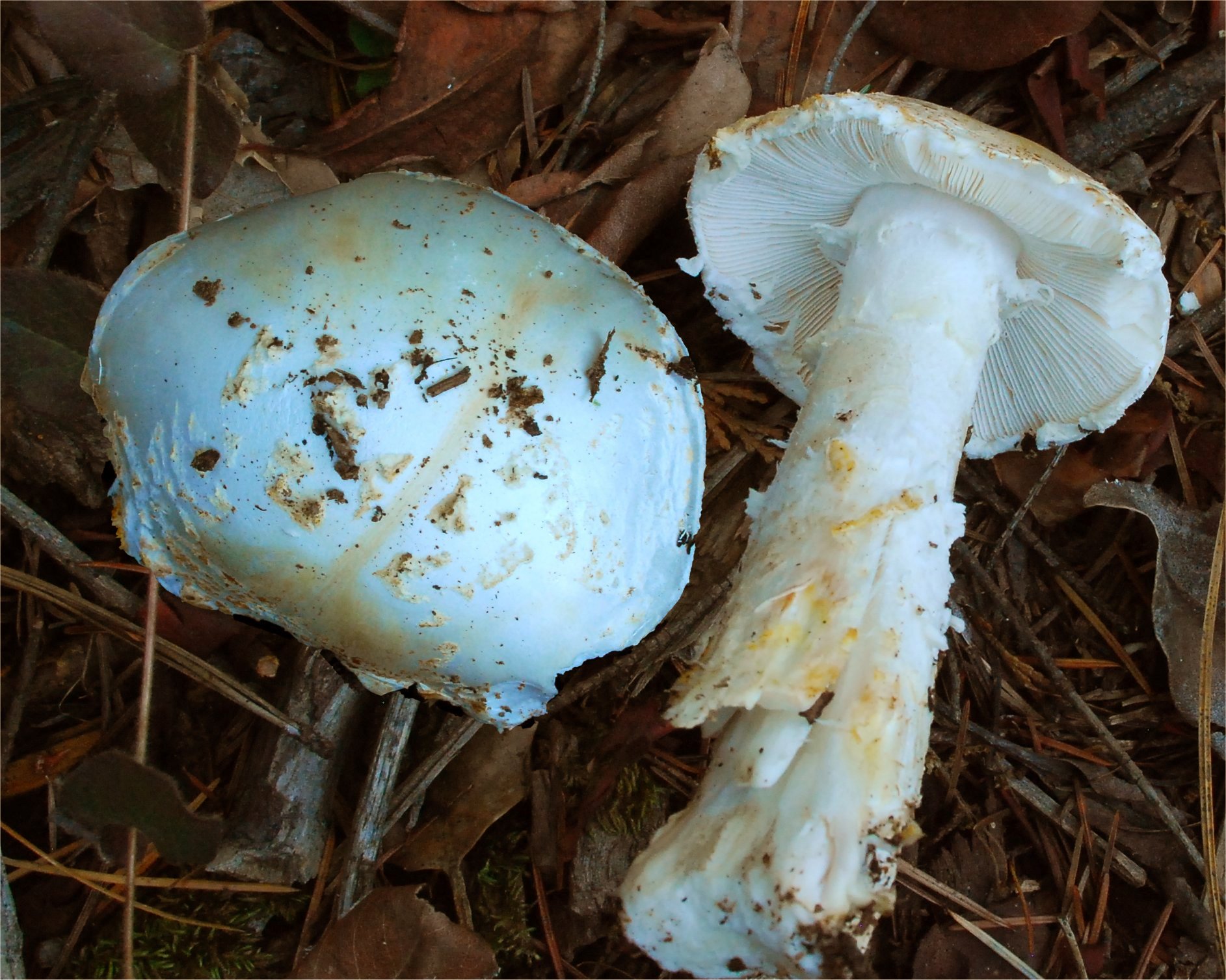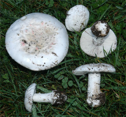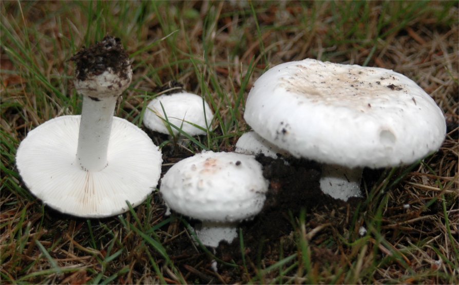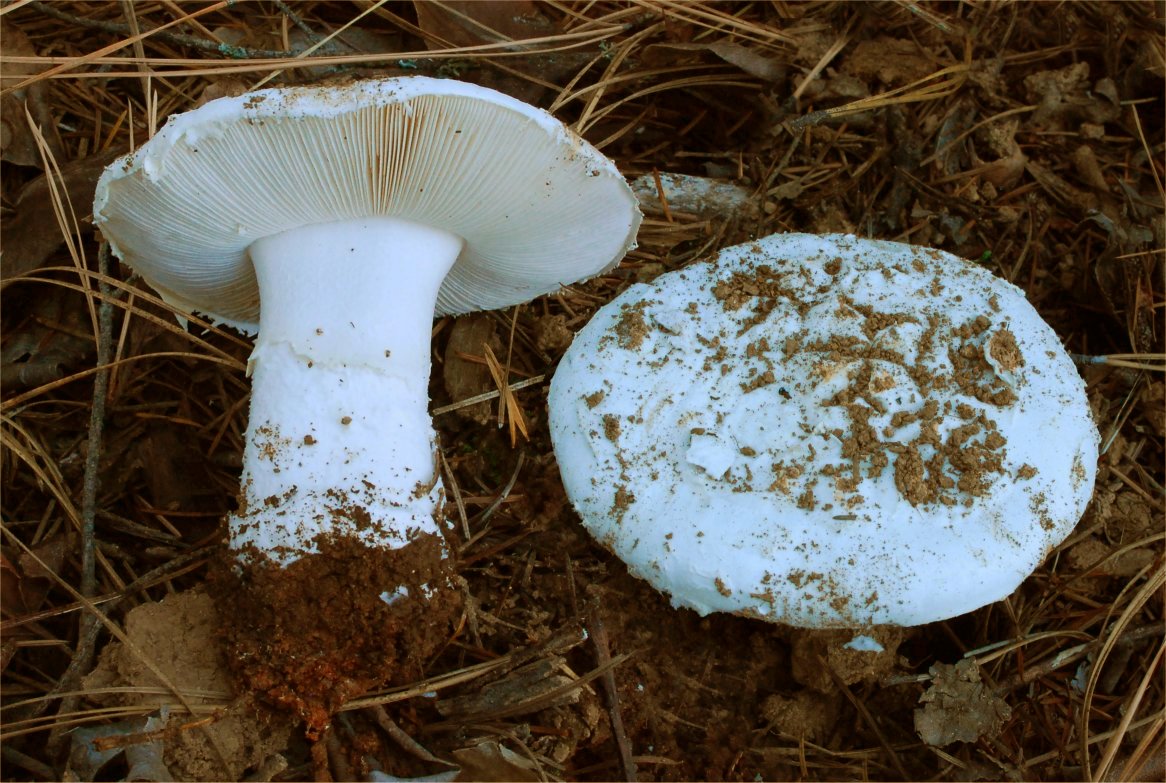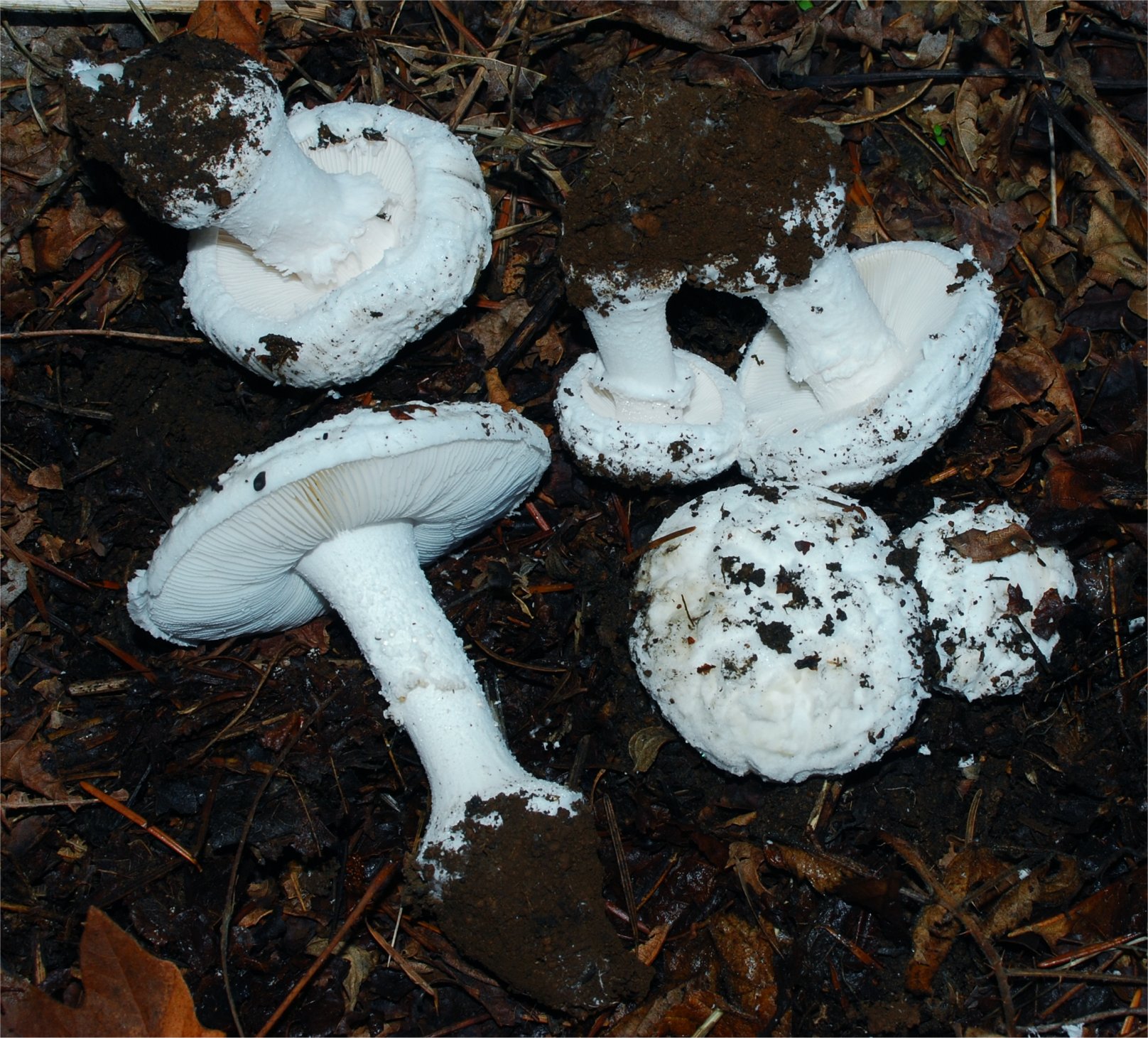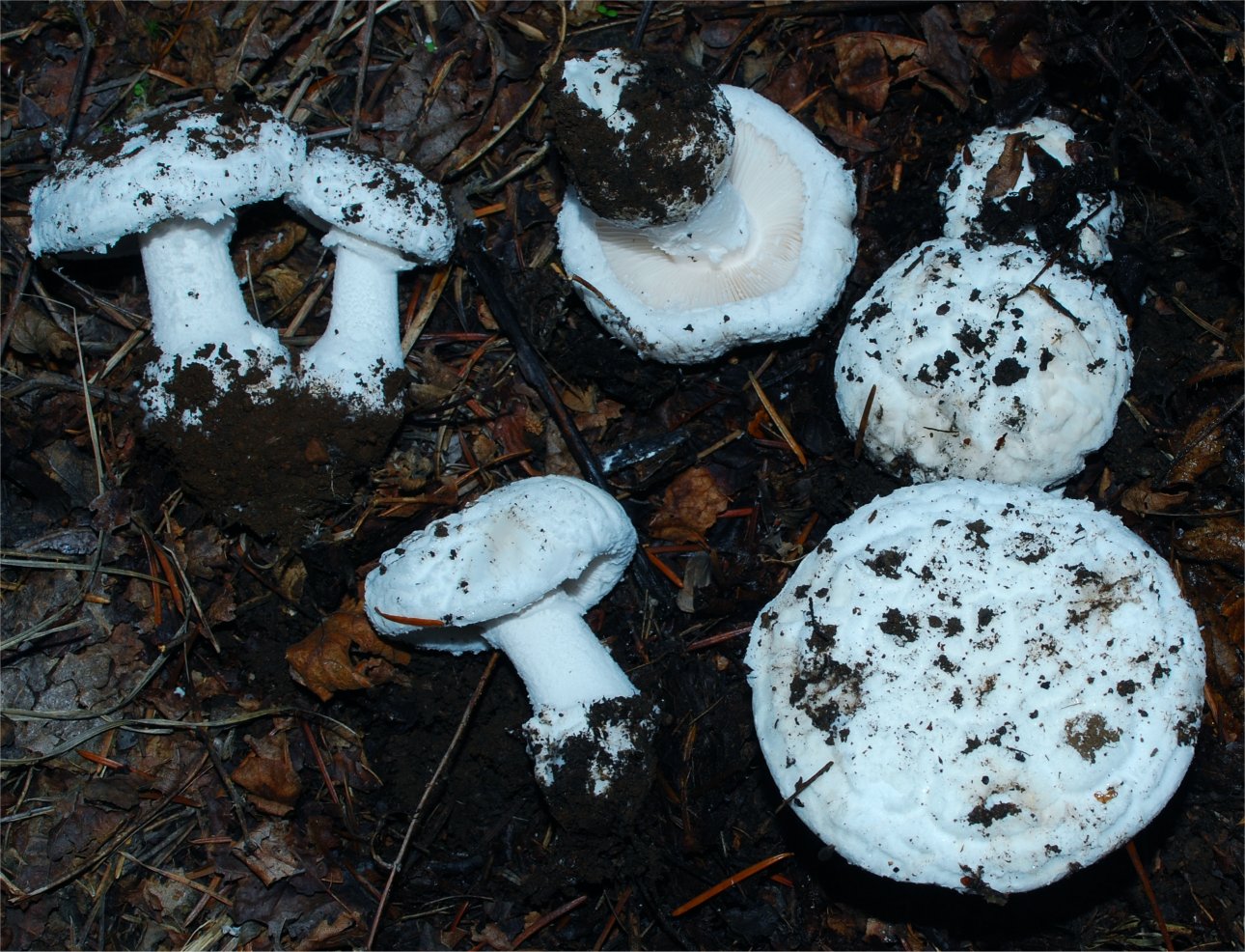 | Amanita silvicola is a white mushroom with friable annulus and thick universal value that sometimes stains/bruises reddish. It is quite common in Northern California and Oregon. It's appearance is less shaggy than Amanita smithiana and rarely has a rooting bulb. |