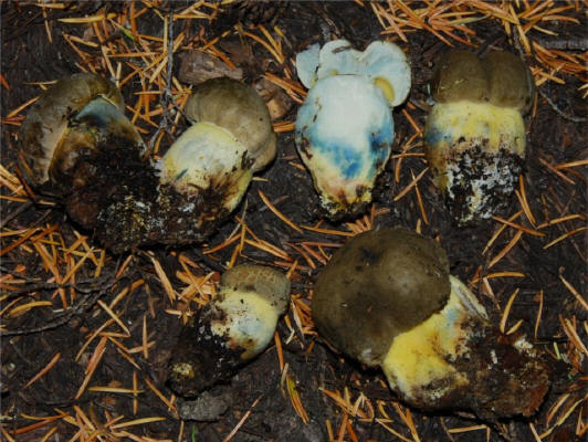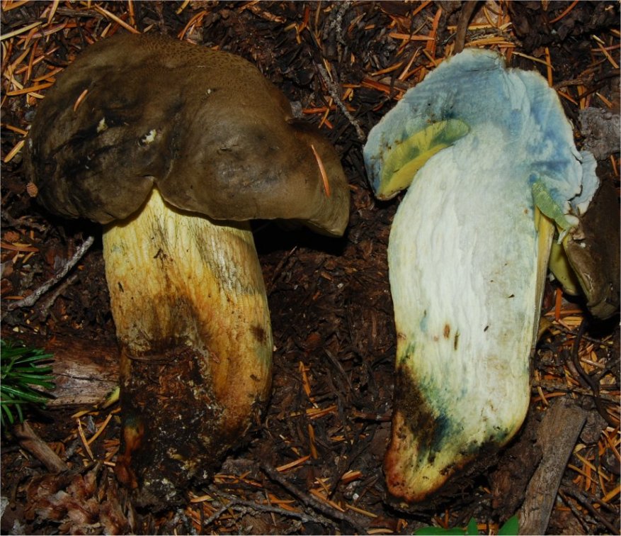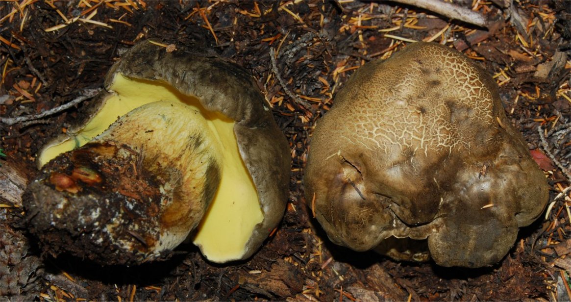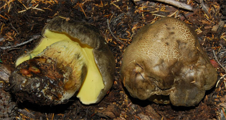 | This species is quite similar to B. calopus var frustosus, but lacks any red color on the upper stipe. At the same time it fullu qualifies for the epitet "Bitter Butter Bolete" Equally buttery and bitter. Distribution: Alaska to Oregon, under conifers. I have never seen it in California. Based on my observations in Oregon, I suspect that it is associated with Tsuga sp. |