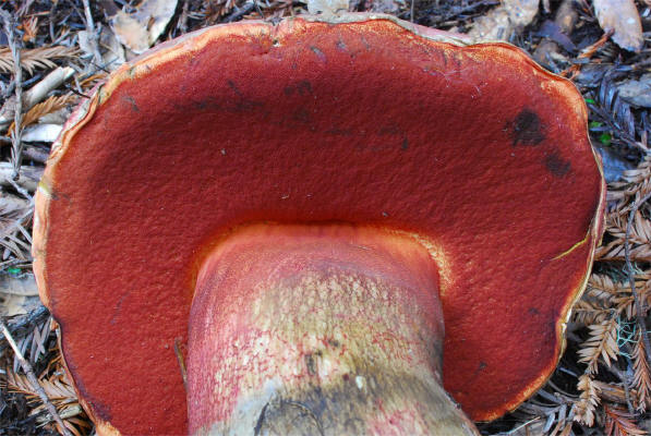 | The group of reticulated, red sponged, and bluing Boletes form Section Luridi. These are some of the most gorgeous representative of the genus, featuring vivid red sponge and a reticulated stipe. The members of this group pass loosely as Satan's Boletes, although that there are about a dozen species in there. This California taxon was involved in a little taxonomic mess involving the name B. eastwoodiae, but a 1976 paper by Thiers&Halling erected the current name and straightened things out. This species by definition is confined to the Coastal areas. A somewhat similar Bolete, called B. haematinus fruits high in the Sierra Nevada. |