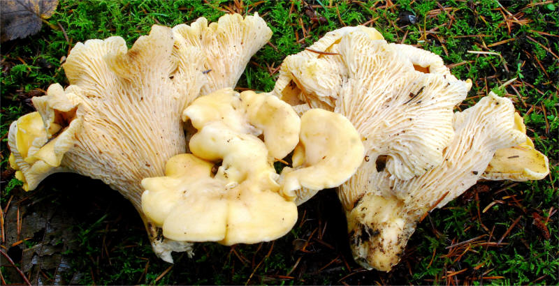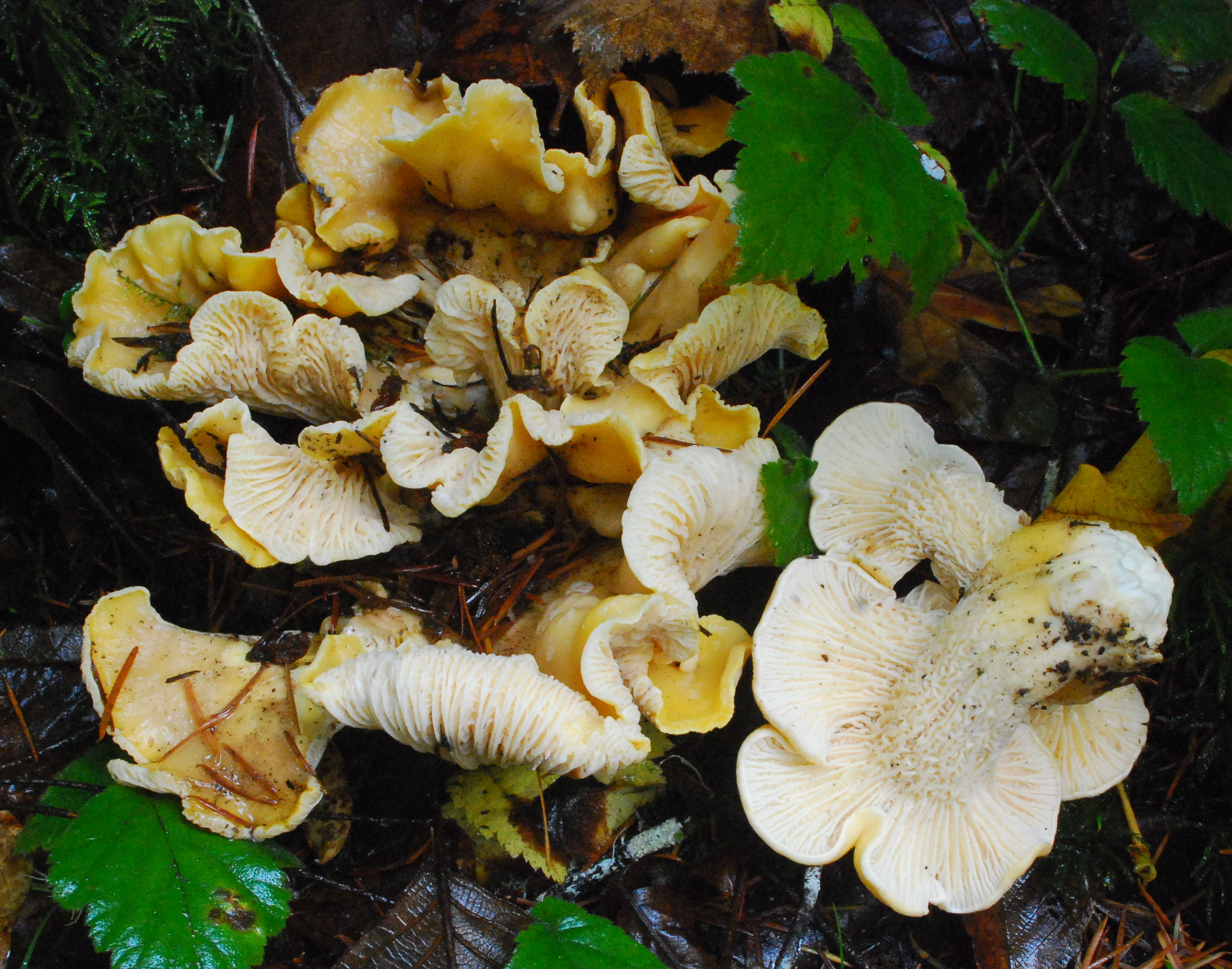 This distinctive Chanterelle is fairly common in Oregon and is found in the more Northern coastal counties of Calfironia as well. The popular name is "The Hybrid" because it looks like a mix between the White Chanterelles (Cantharellus subalbidus) and the local yellow varieties.