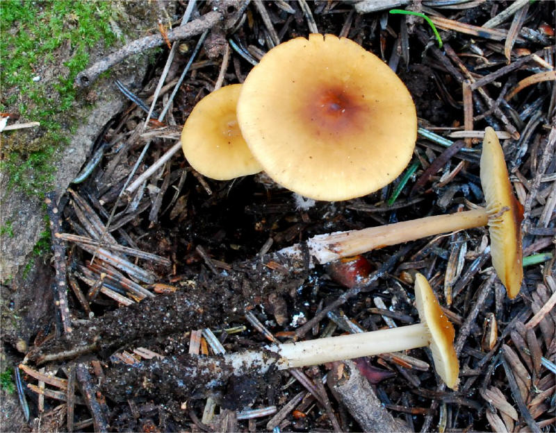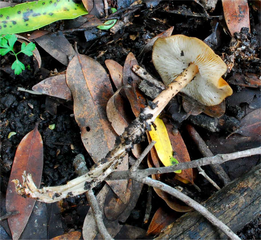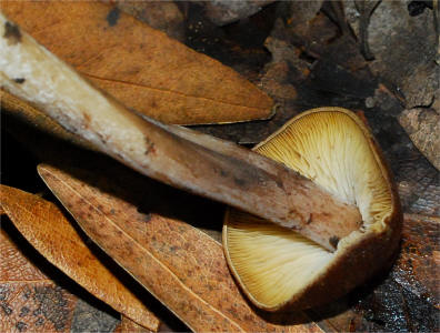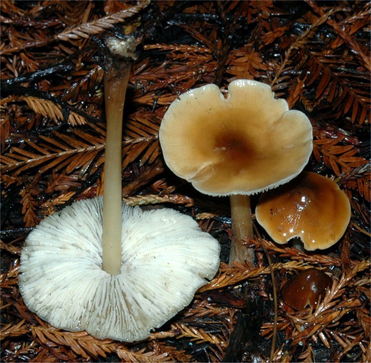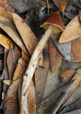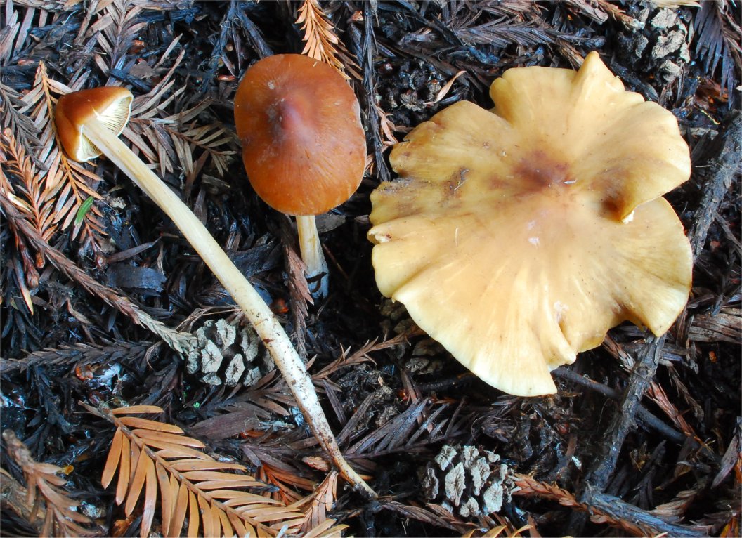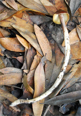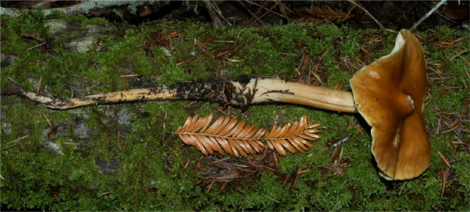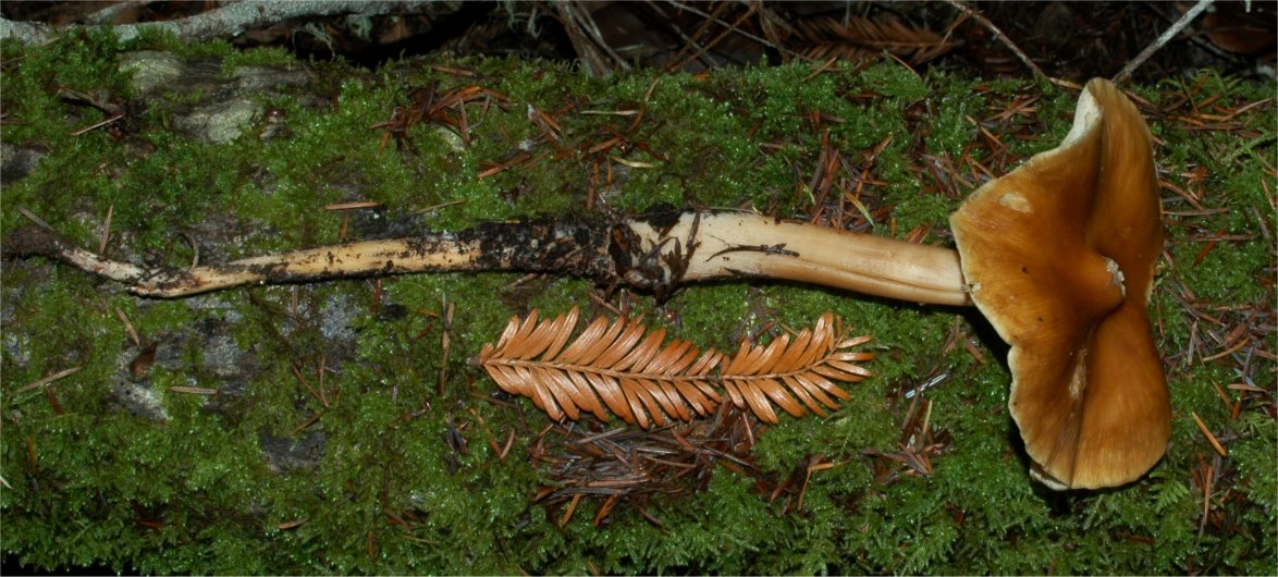 | This is one of the truly amazing species from California that appears to be almost endemic to the State. Associated mainly with Coastal Redwood (Sequoia sempervirens), the rooting stipe tends to reach quite deep in order to connect to the tree's root tips. It appears that this species can switch hosts because I see it in a pure stand of California Bay (Umbellularia californica) where absolutely no Redwood is present even after careful investigation. This matches the reports of other sightings from the Pacific Northwest where no Redwood is present. | ||