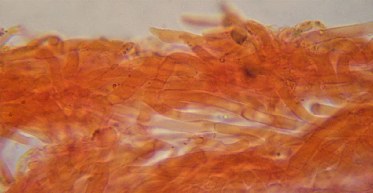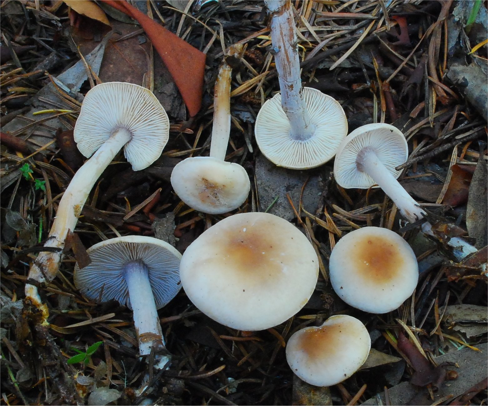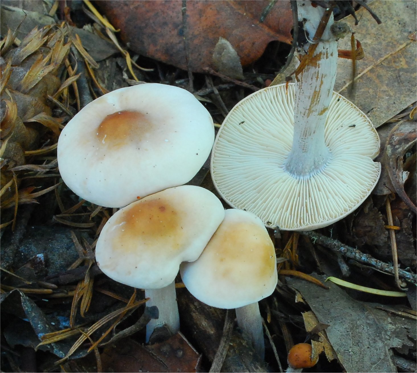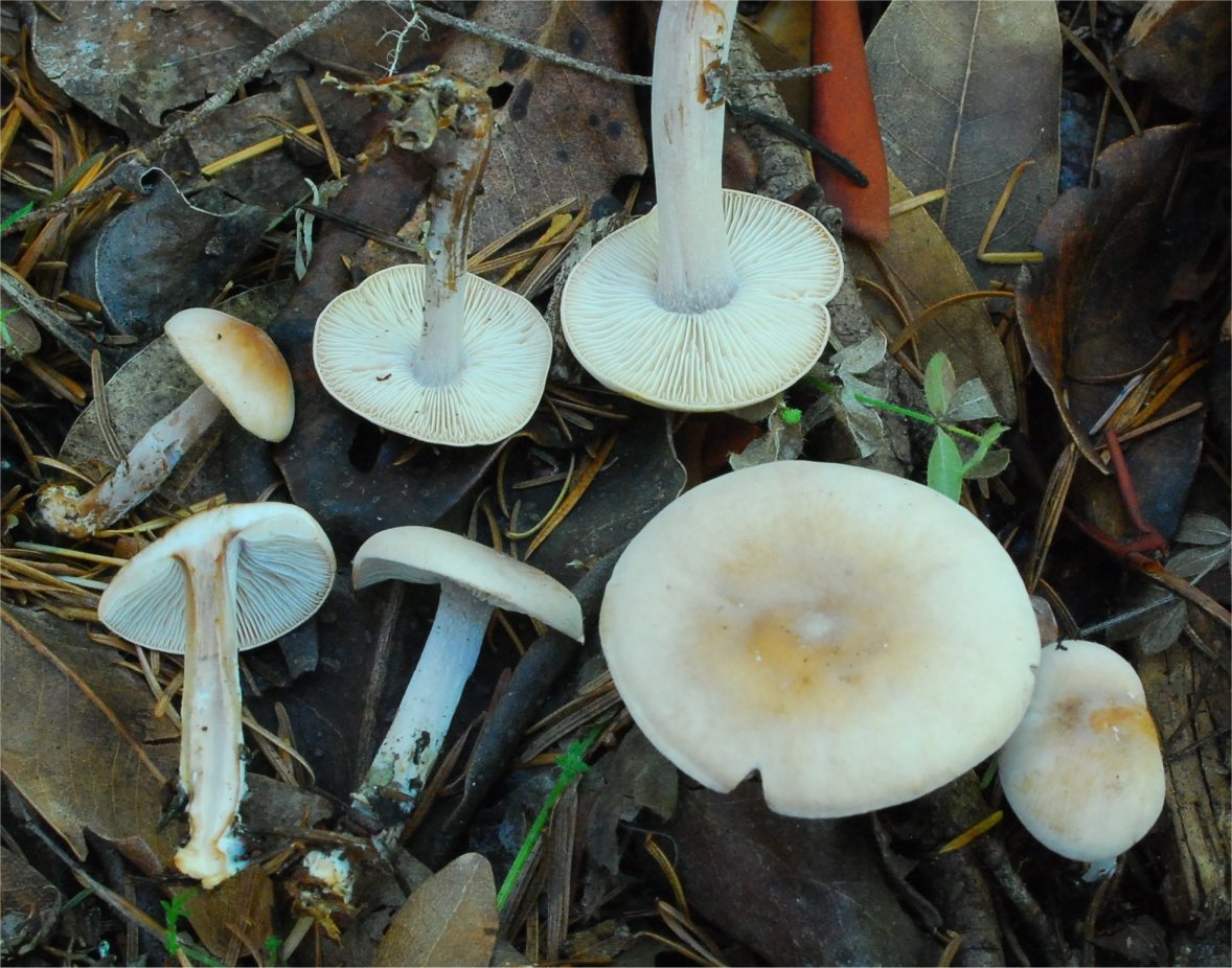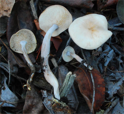 | I collected this Collybioid species in the Fall of 2008 in several patches in an area that I had checked many times before, but never seen anything like it. After consulting all of the top pros in Gymnopus and related Genera, it appears that this species is undescribed. There is a light bluish cast in the upper portion of the stipe. | ||