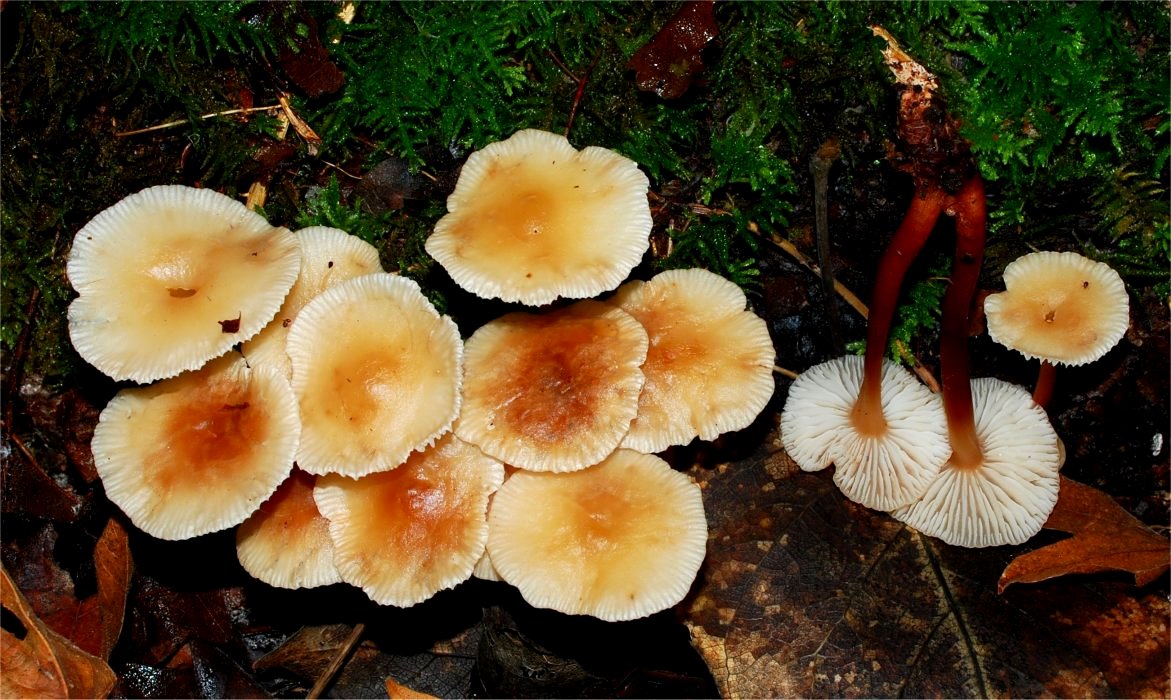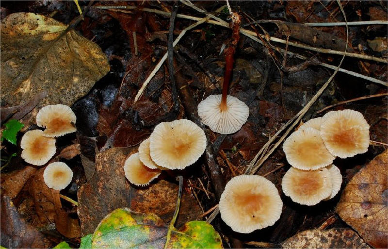 | There is another red stemmed Gymnopus with caespitose habit, which has smaller spores and usually appears where conifers are present: Gymnopus acervatus |