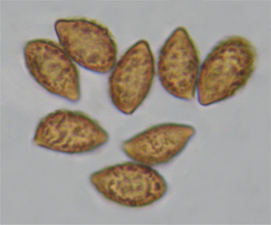 Spores: 10.2-12.3x6-7.3µ very coarsely verrucose |