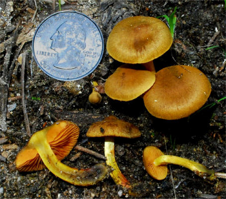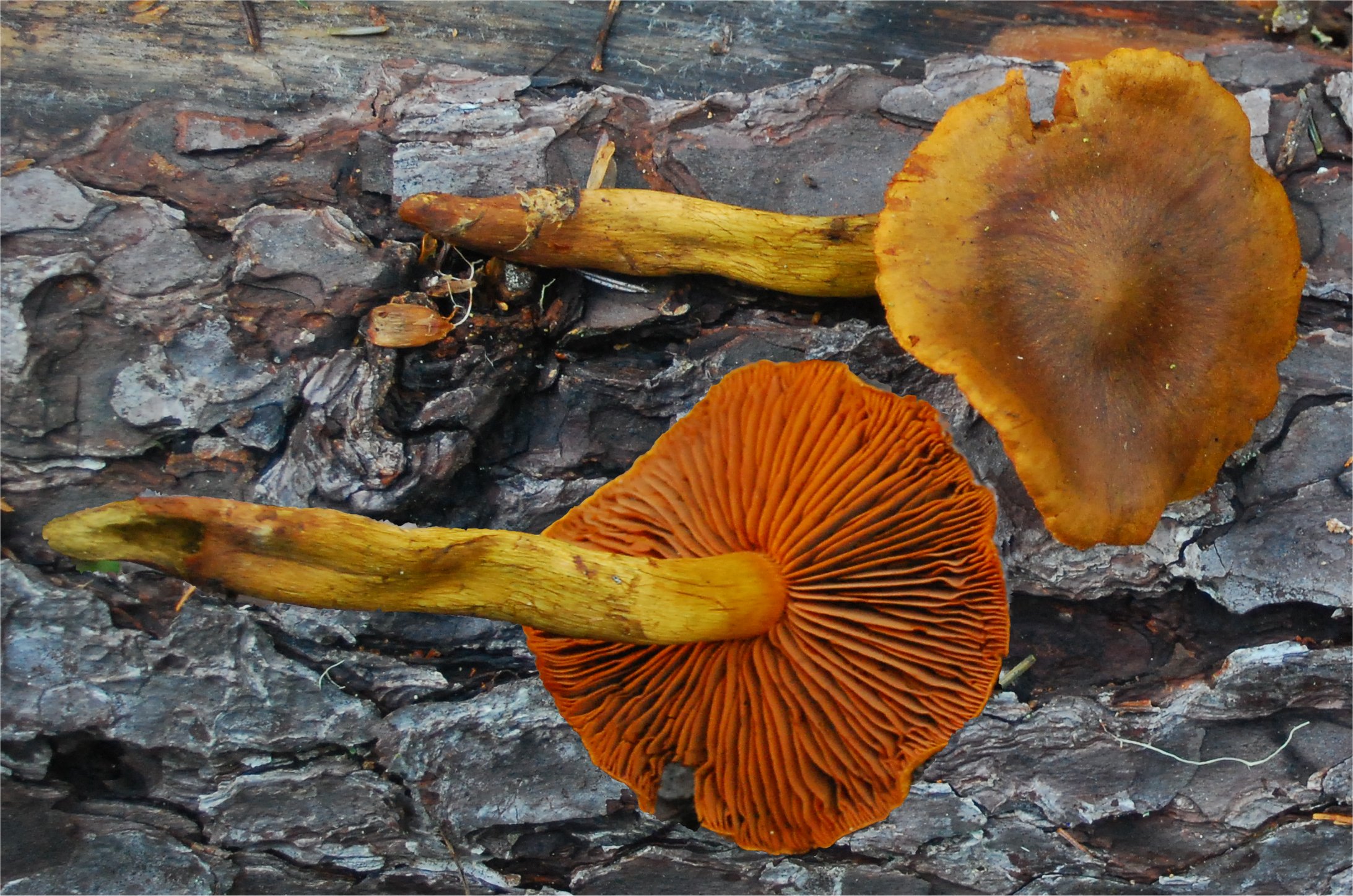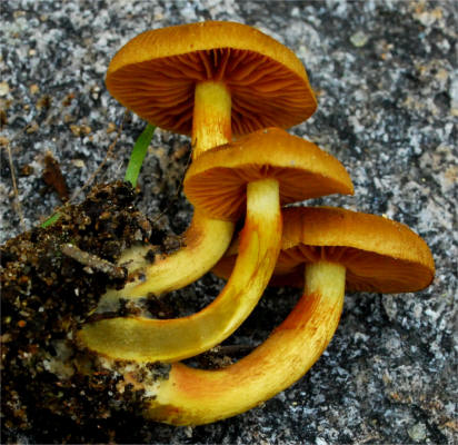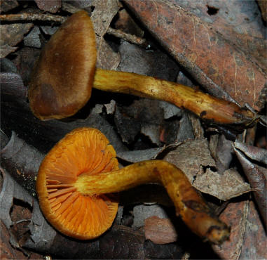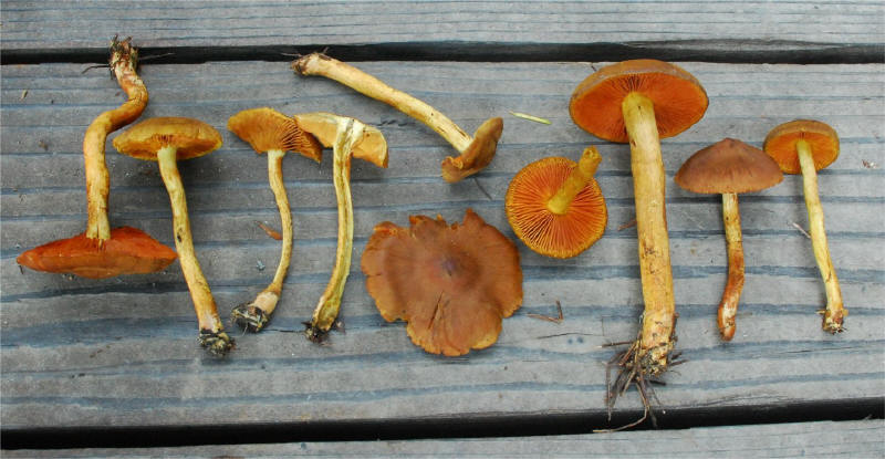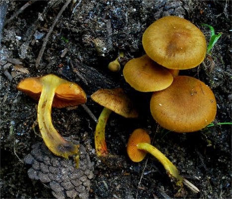 | Interpreting the difference between Cortinarius croceus and Cortinarius cinnamomeus may be challenging at times as intermediate forms seem to exist. The main guideline is the gill color -- in cinnamomeus the gills have a strong orange color, while in croceus they tend to be more yellow to mustard. | ||