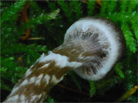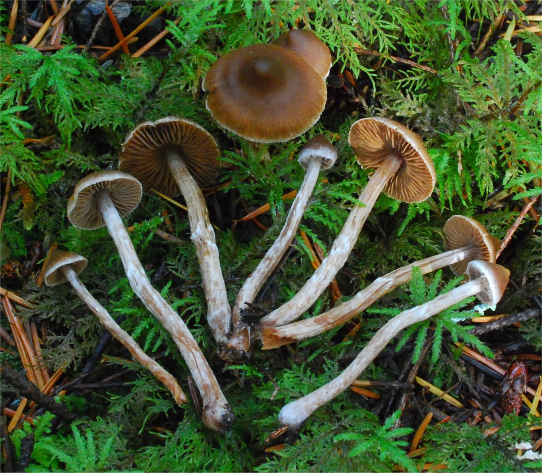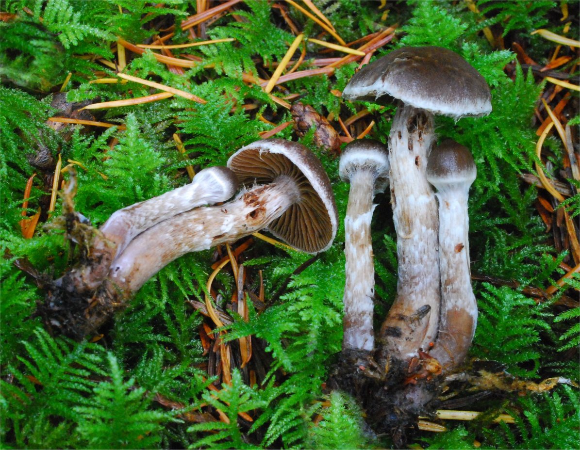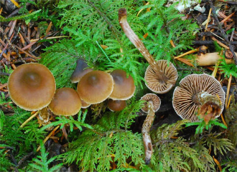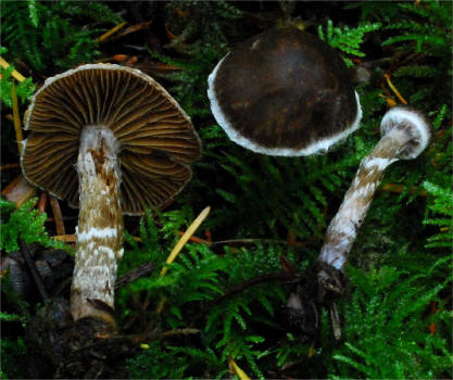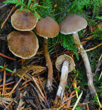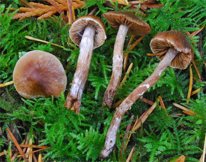 | This Telamonia is quite common in the cool, moist Spruce and Hemlock forests of the Pacific Northwest, typically amongst mosses. The primary distinguishing characteristic is the strong fragrant odor between pelargonium and cedar. The girdles of veil remnants on the stipe are quite distinctive too, but not limited to this species only. The varieties flexipes and flabellus have been recognized based on the degree of scaliness of the pileus. I have seen the true scaly form Cortinarius flexipes var. flexipes in Scandinavia. | ||