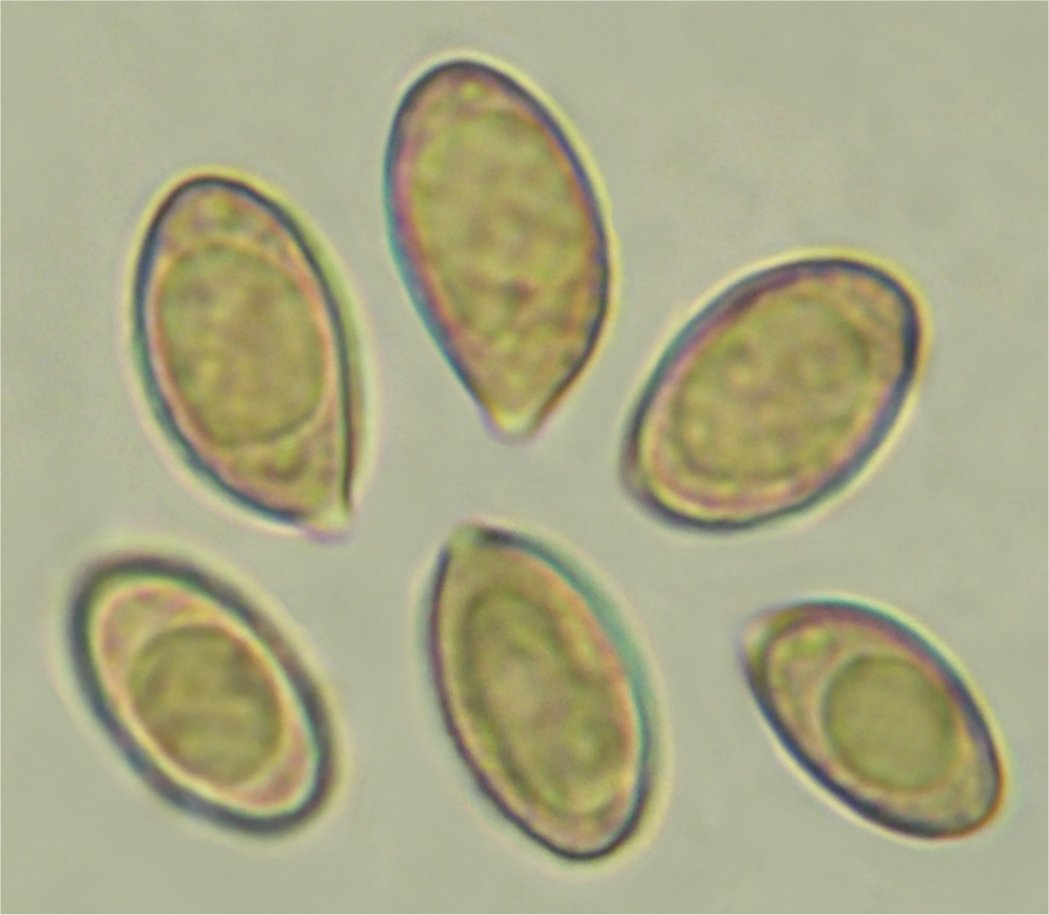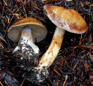 Cortinarius montanus. Some of the common features of species in Section Scauri: 1) Distinctly hygrophanous pileus with characteristic concentric water marks, or darker water spots near the margin. The hygrophanity persists regardless whether the pileus is glutinous or not; 2) Yellow-greenish universal veil remnants on the bulb; 3) Purple to vinescent reaction with iodine on the context; 4) Ellipsoid spores (simple shaped) of medium to low verrucosity; 5) Olive-blue to olive-gray lamellae |