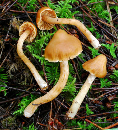 | The complex of species around Cortinarius obtusus (Section Obtusi) contains some rather non-descript, small, Telamonias with somewhat Galerinoid stature. One of the most commonly cited features of this complex is the odor of iodine, particularly on drying. I have not been able to detect that odor very clearly in our Western material (nor did A.H. Smith). In the Pacific Northwest there seem to be a number of integrating forms with the much more slender Cortinarius acutus. | ||