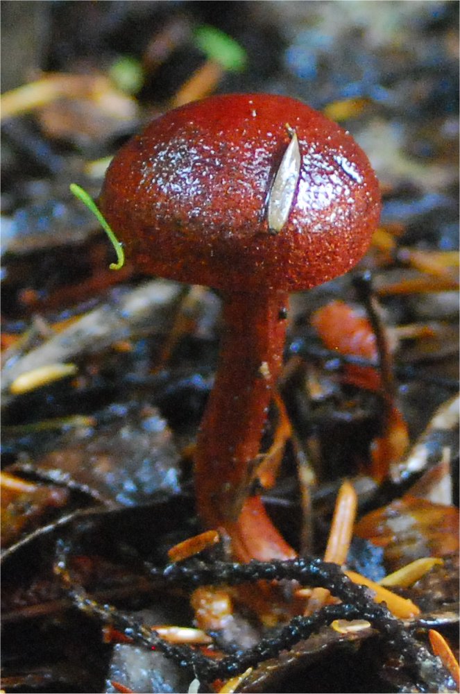 | The small, fully red Dermocybe is a treat to the eyes when seen in the field, but in my experience it is not very common in the Pacific Northwest. The few collections that I have inspected feature the same small and lightly ornamented spores as described from Europe. There is another closely related species from Sierra Nevada Cortinarius sierraensis. | ||