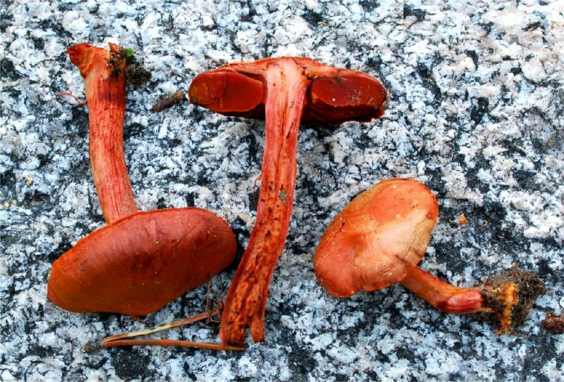 | This is a small, fully red Dermocybe from the higher elevations of t Sierra Nevada where it was described under Lodgepole pine (Pinus contorta var. latifolia) . These collections from the same location. Genetically, this species is closely related to Cortinarius sanguineus. |