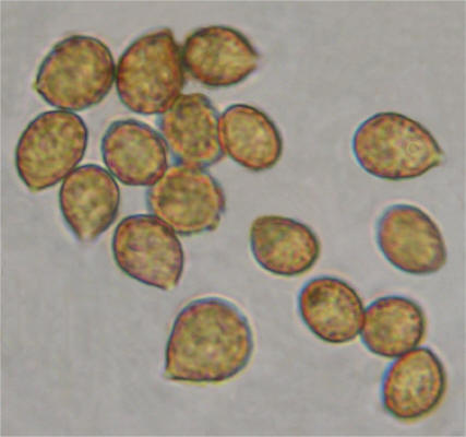 broadly ellipsoid to subglobose spores and yellow UV fluorescence place it