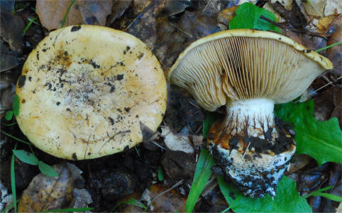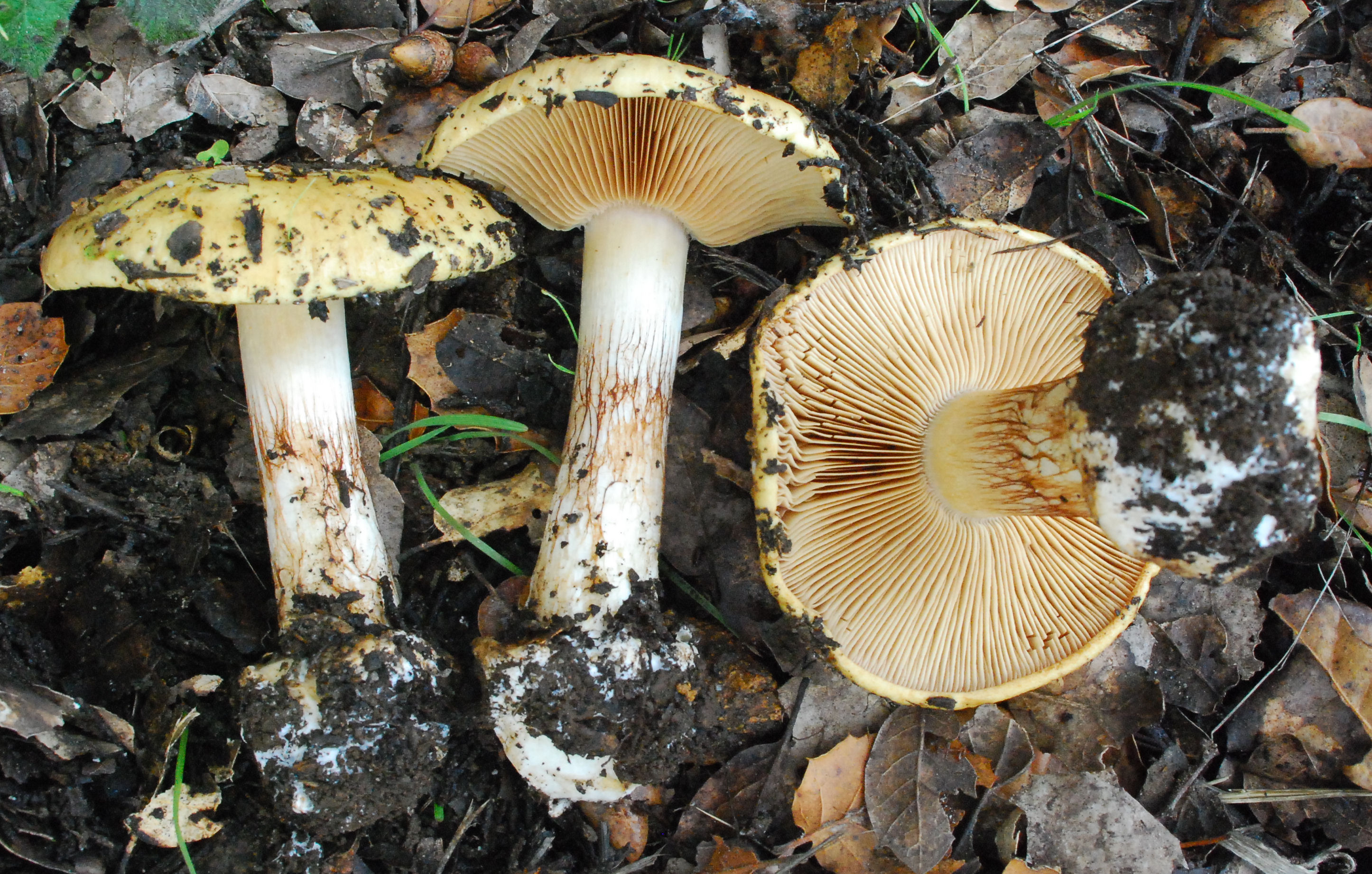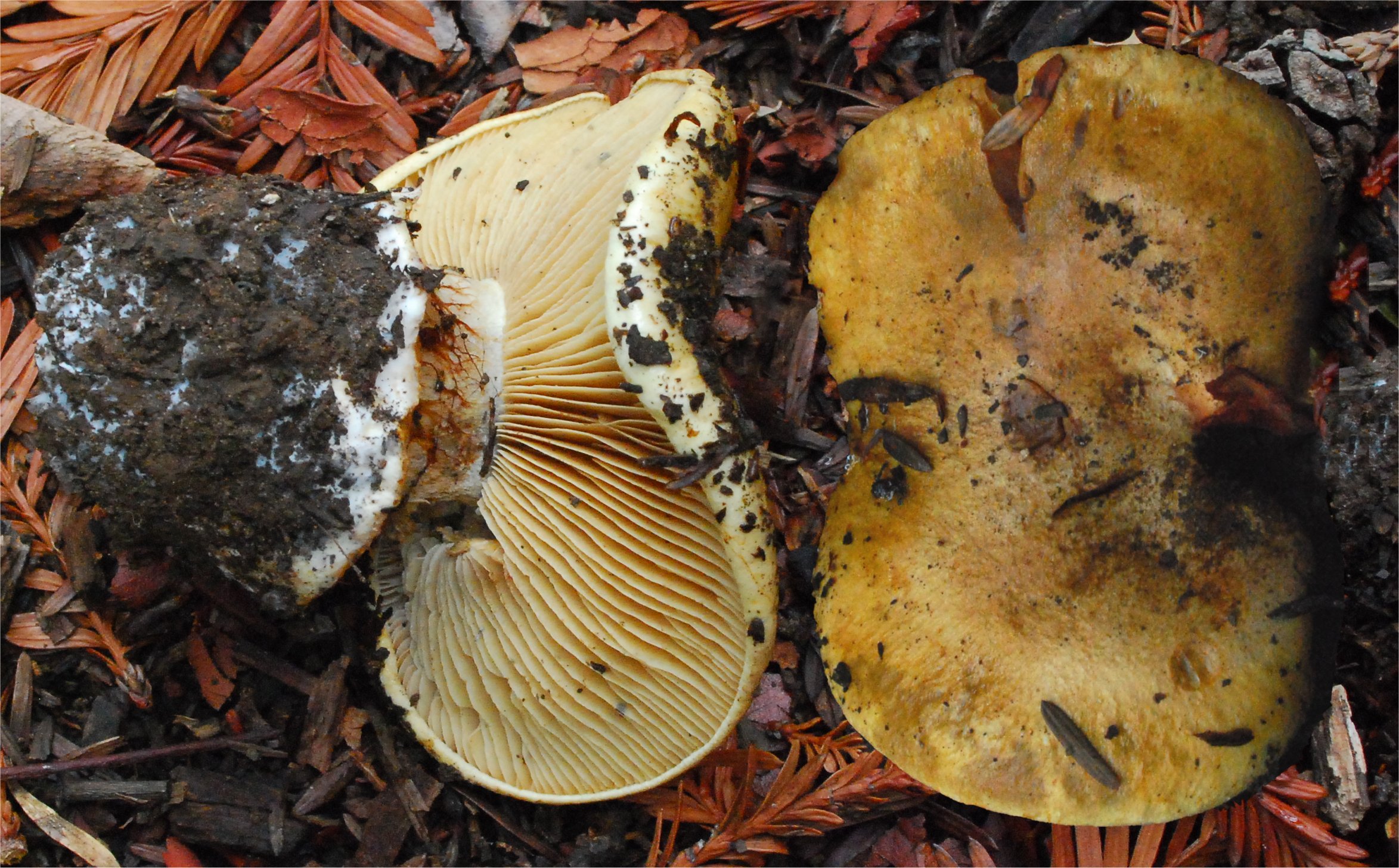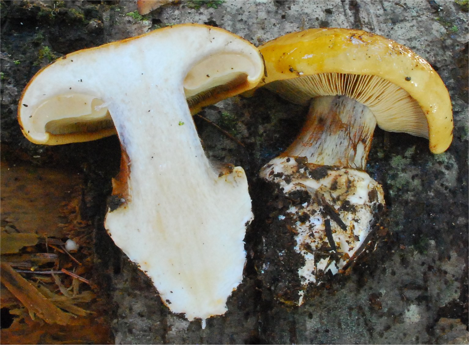 Cortinarius xanthodryophilus is a commonly encountered species under Live Oak (Quercus agrifolia) in California. In the Sierra Nevada foothills we have collected it under Interior Live Oak (Q. wislizenii) and Canyon Live Oak (Q. chrysolepis). In Mendocino Co. it was collected under Tanoak (Notholithocarpus densiflorus). Based on a molecular data match there is a collection (Genbank DQ974721) under Blue Oak (Q. douglasii) in the Central Valley. There is also a collection (Genbank GQ159771) from Vancouver Island, British Columbia, under Garry Oak (Q. garryana). Here is a link to the formal description: Bojantchev D, Davis RM. 2011. Cortinarius xanthodryophilus sp. nov. — a common Phlegmacium under oaks in California. Mycotaxon 116: 317–328. doi: 10.5248/116.317