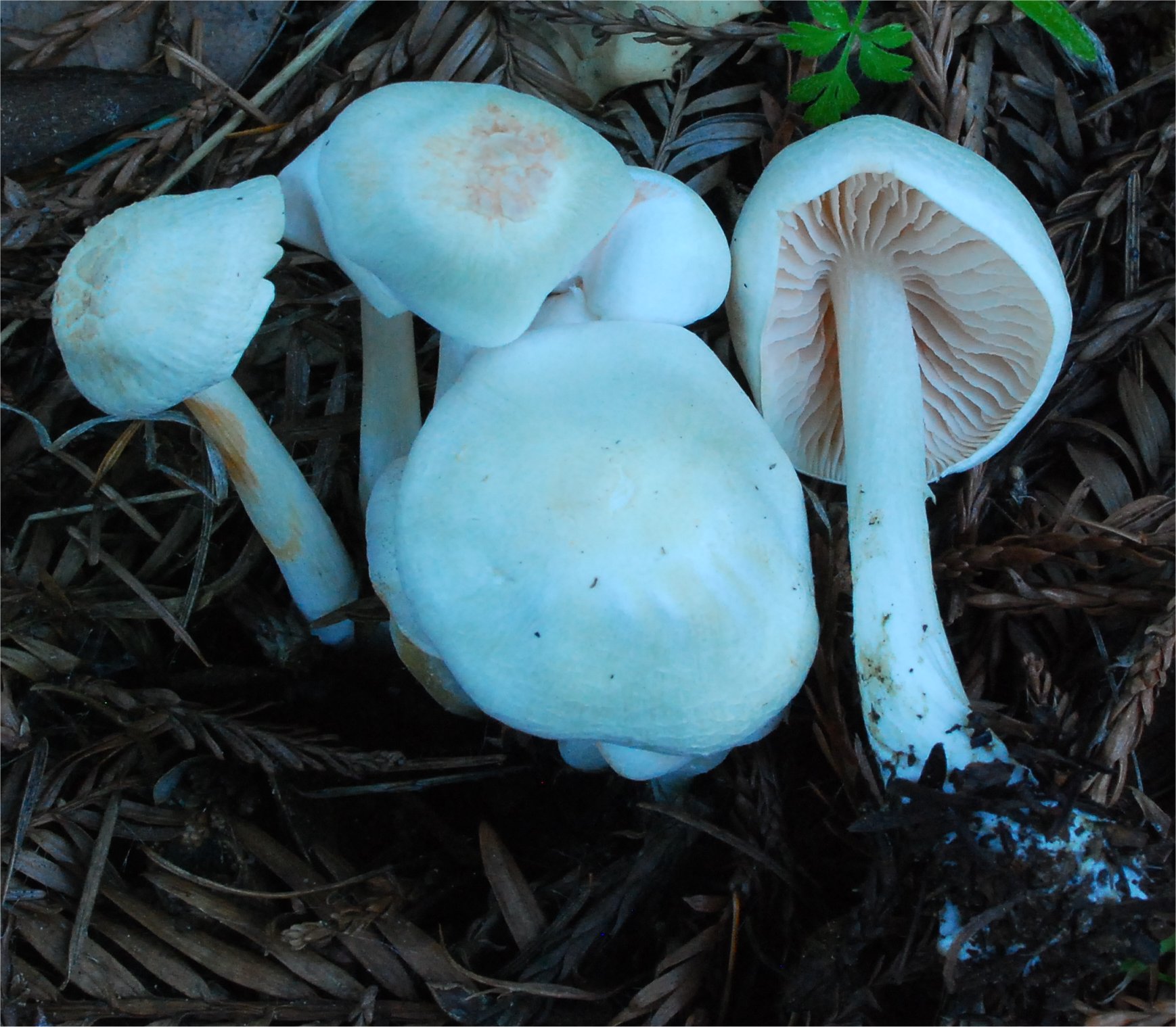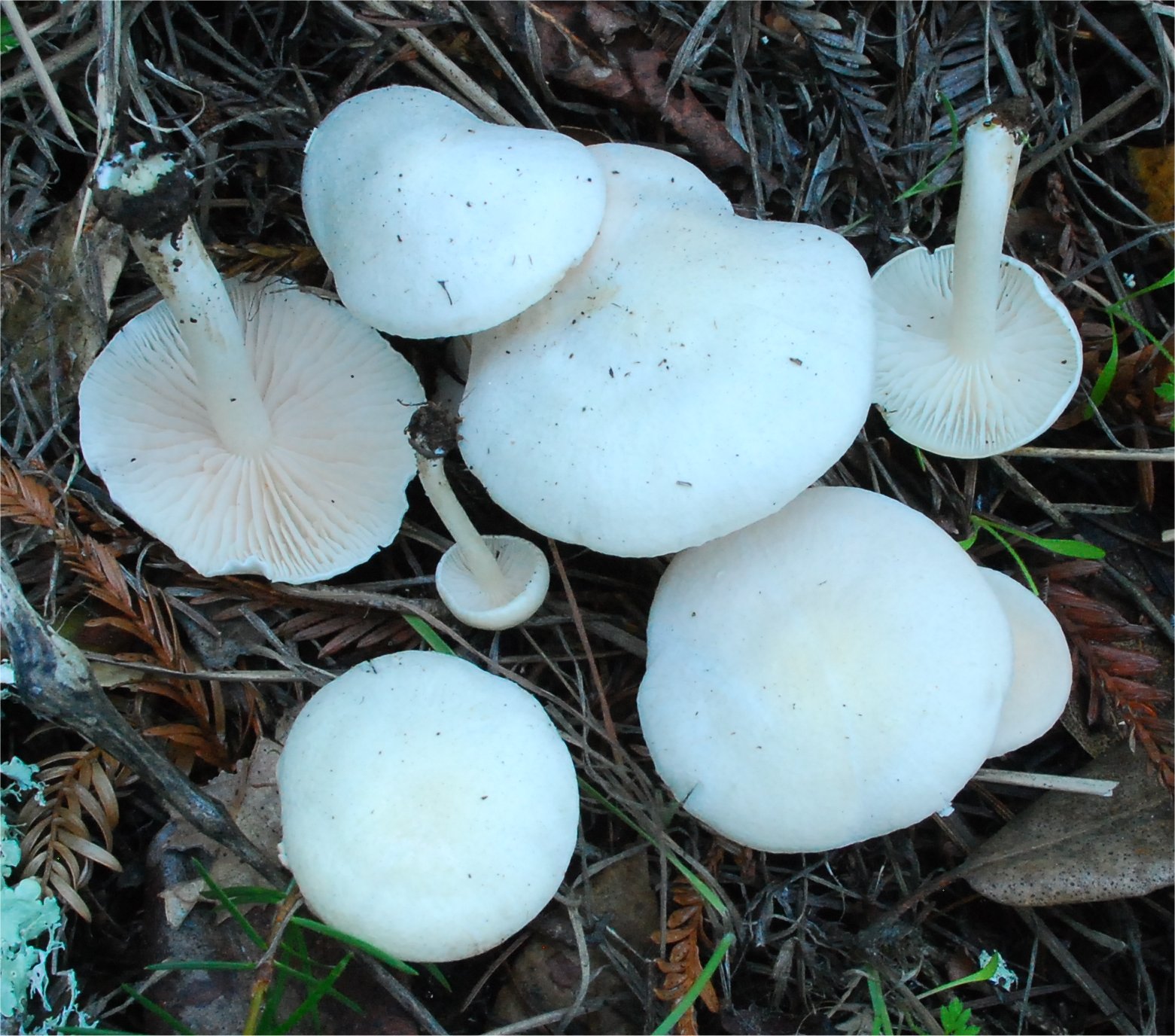 | This white Entoloma is fairly common in Northern Calfiornia. It tends to draw strong affinity towards the European E. speculum, but for now that can only be treated as such. |