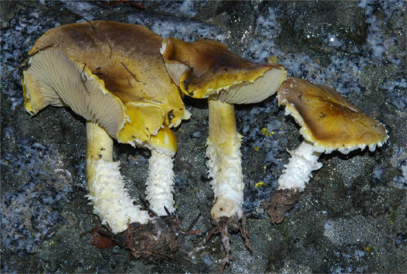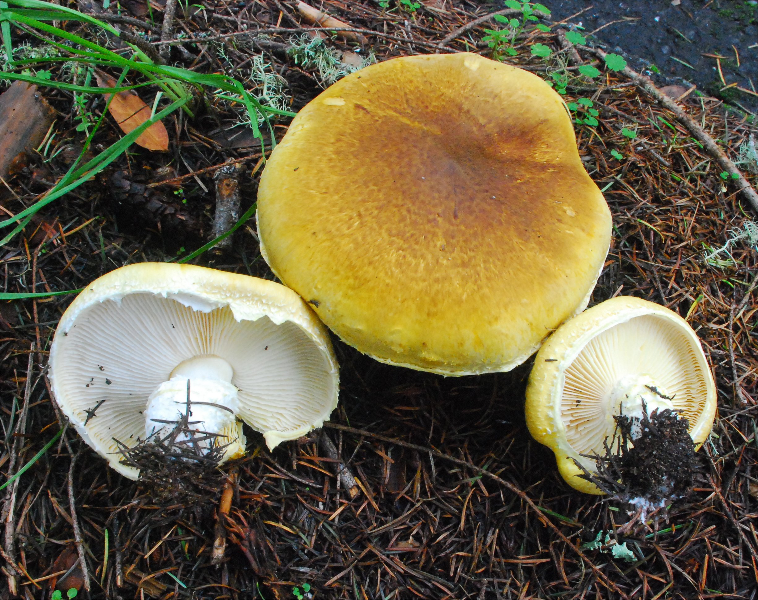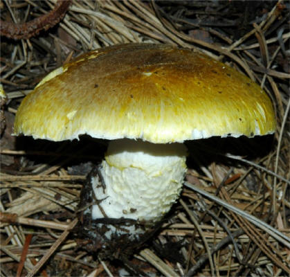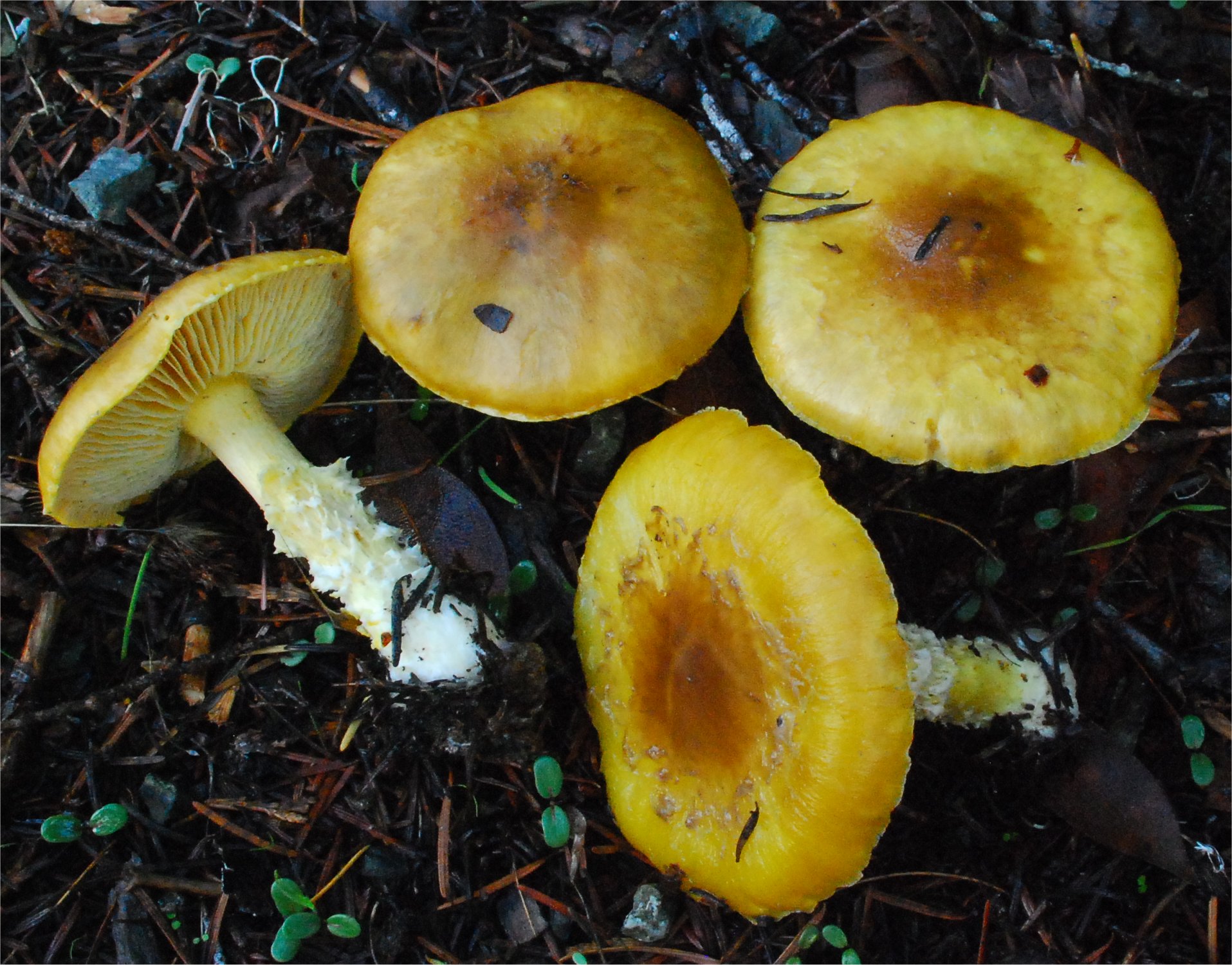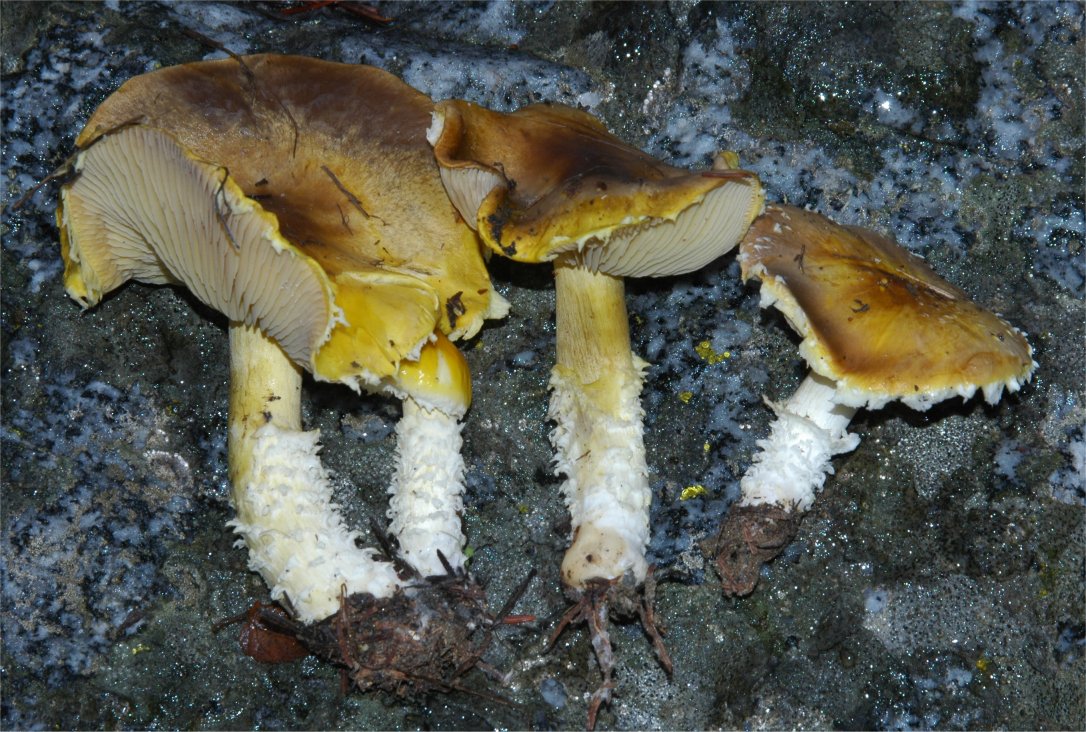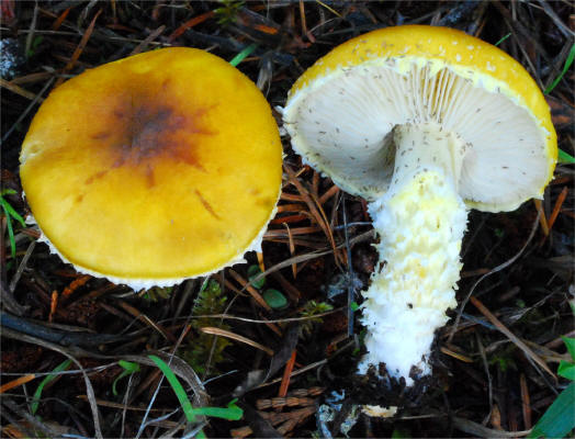 This mushrooms is a delight to the eye with its richly yellow cap and shaggy stem. It is fairly common both Fall and Spring under various conifers, but seems to like better the mountains. It is said to be an excellent edible.