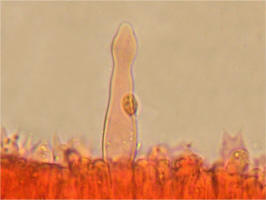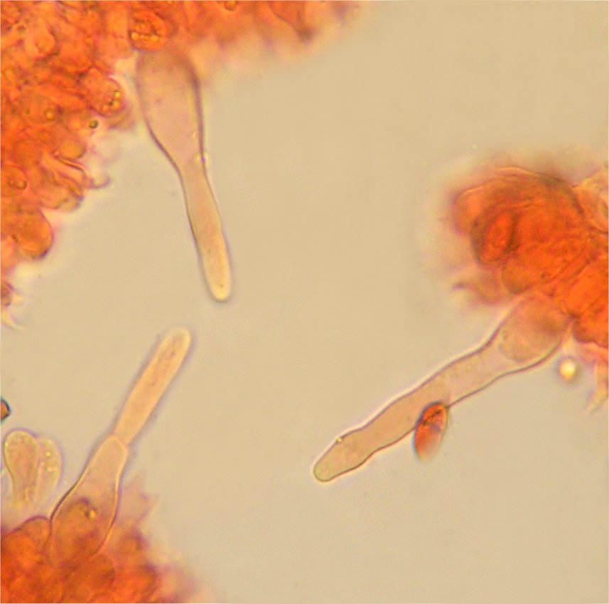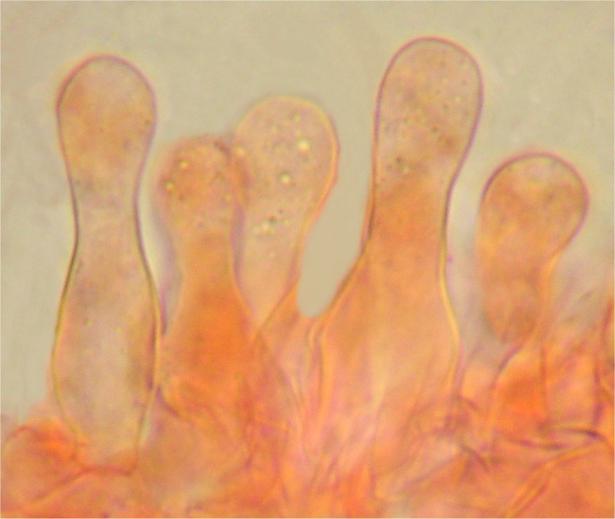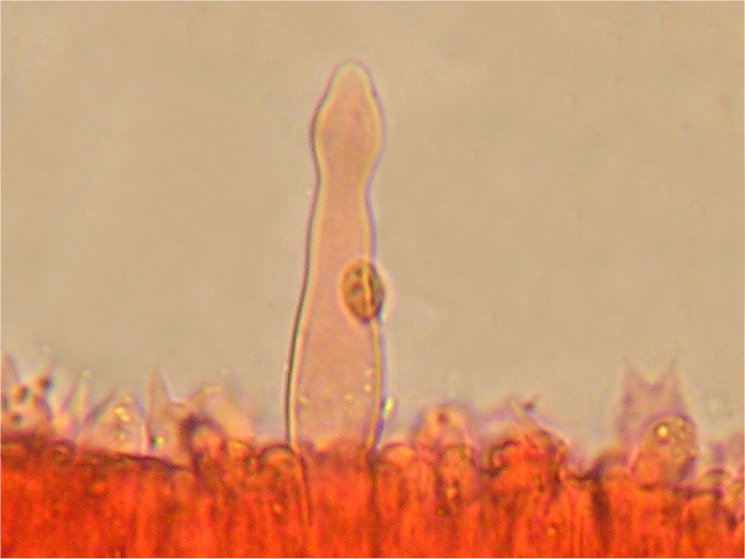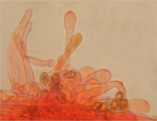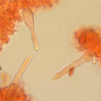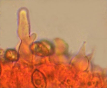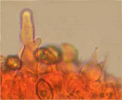| Spores: 9-10.8x5.4-6.2μ | Typical cystidia: | Some cystidia forked and basidia 2 spored |