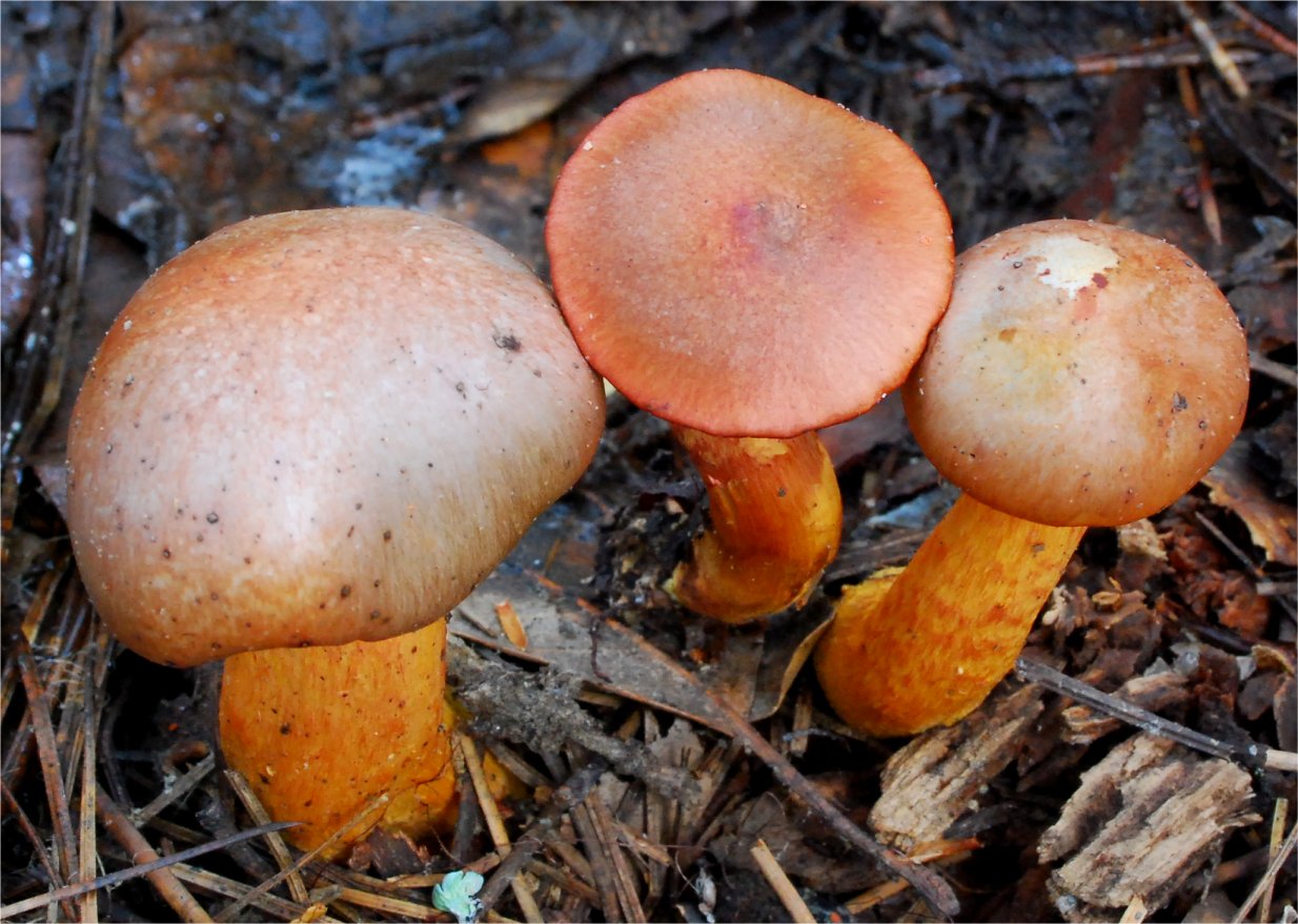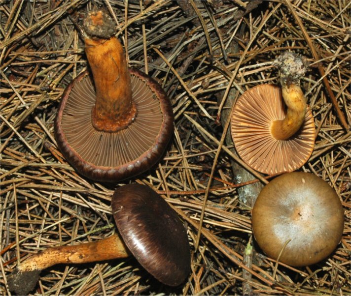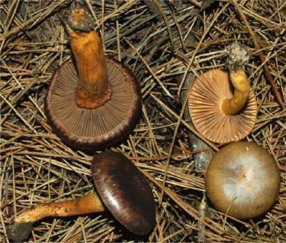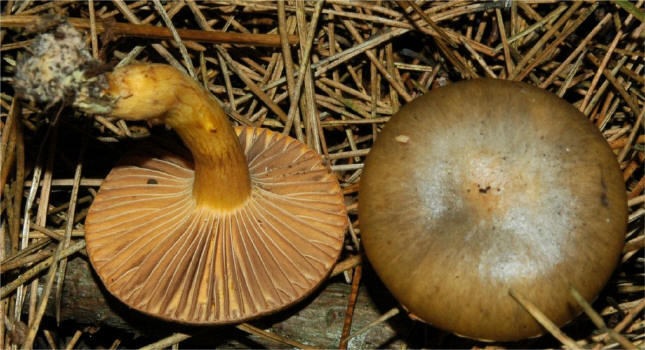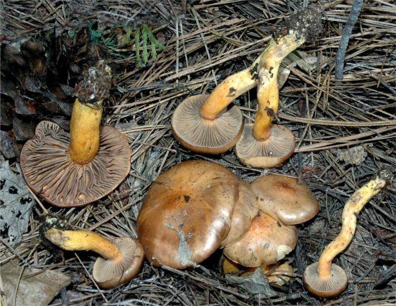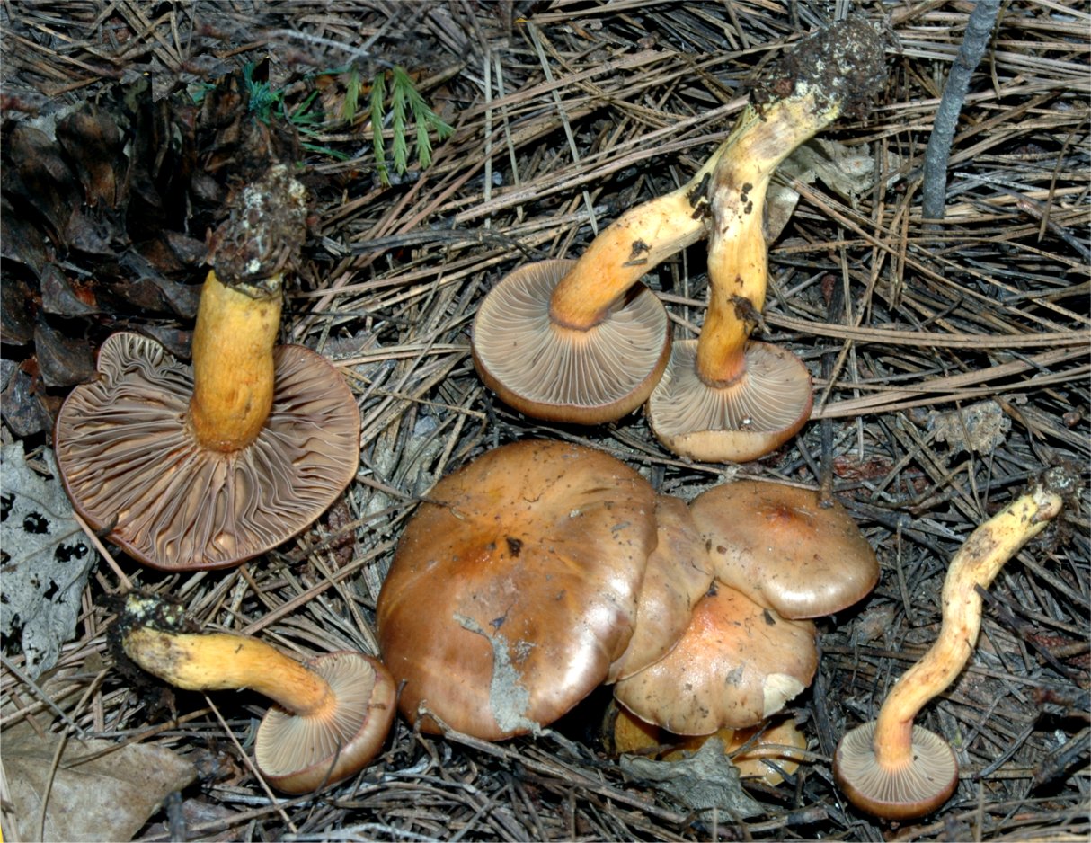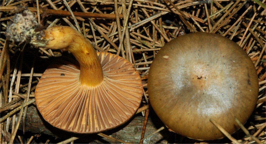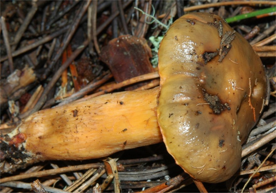 | This is one of the most common Pine associates in California -- typically I see it under 3-needle Pines. The most obvious characteristic of this species are the olive colors on the pileus that later on gives way to yellow/ochraceus. | ||