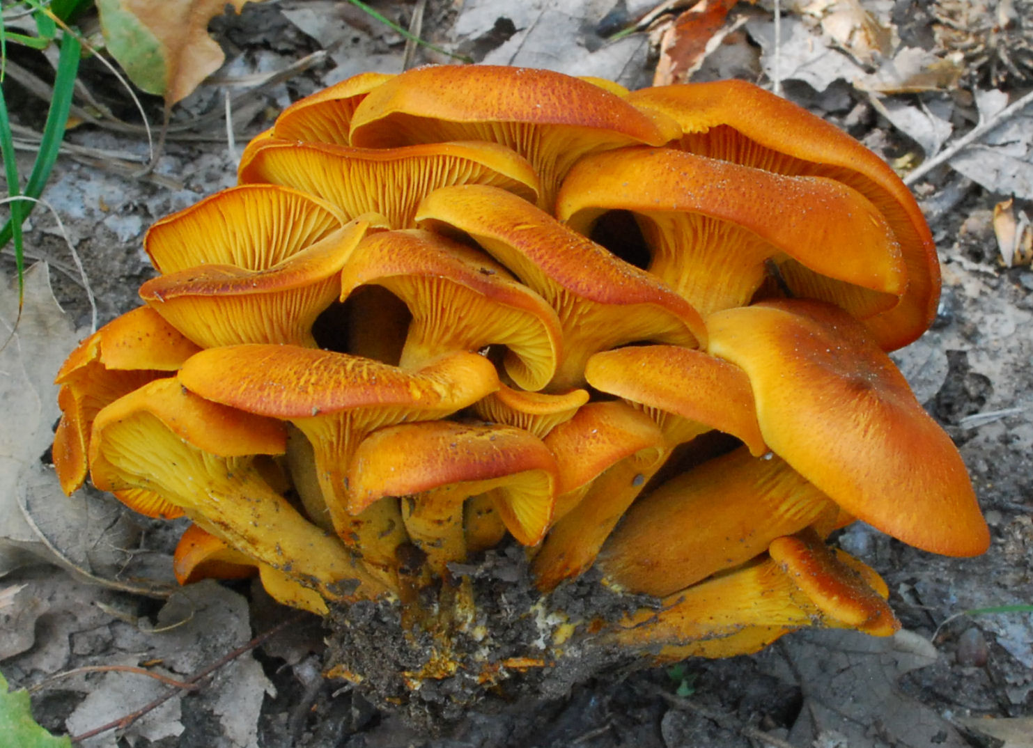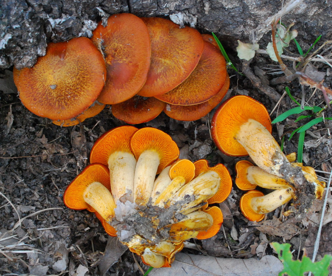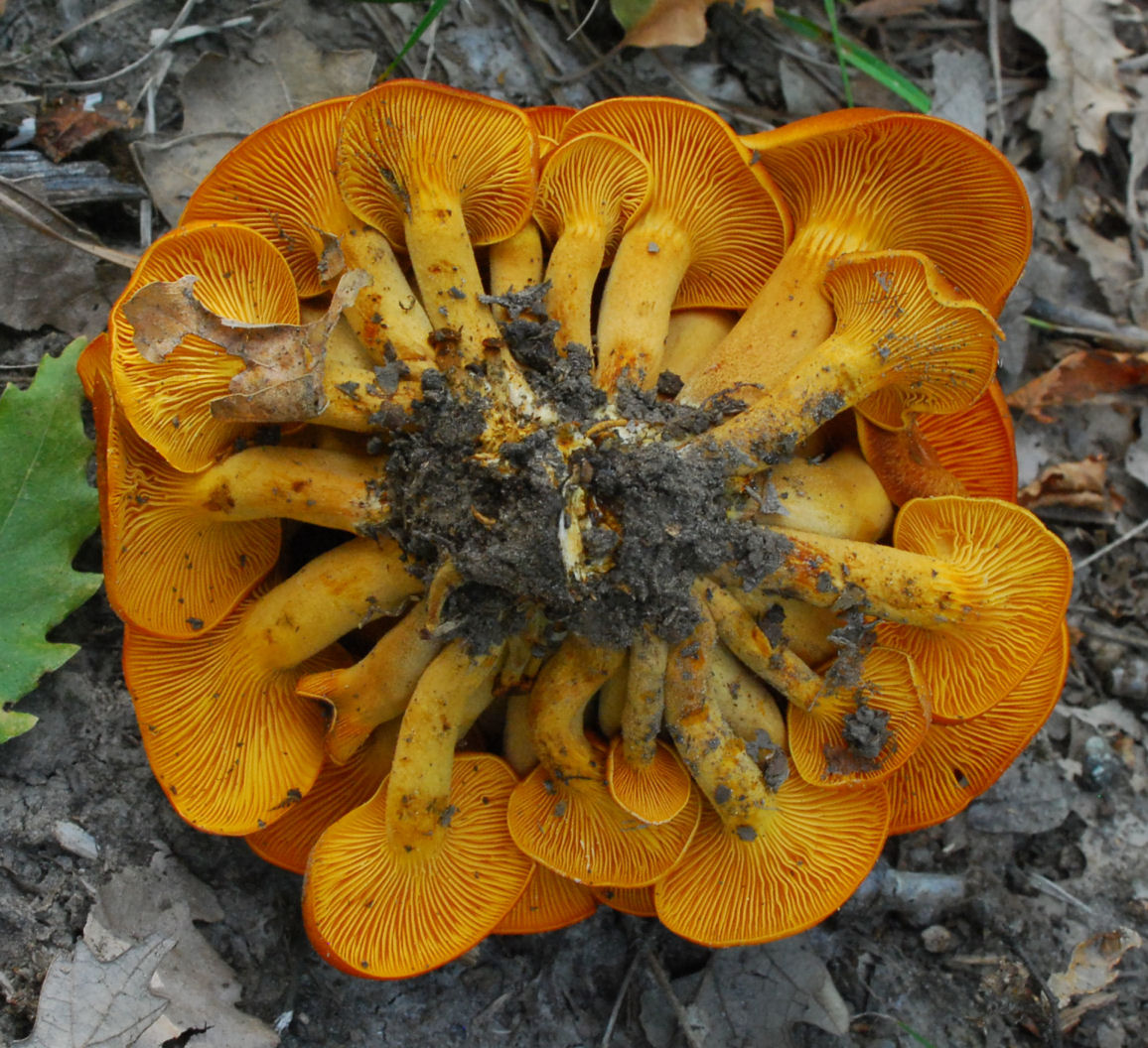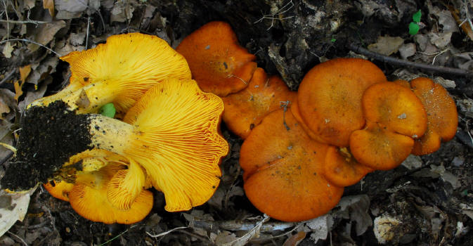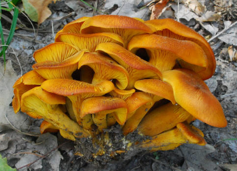 | The popular name of this mushroom is "Jack O'Lantern" based on its fluorescent capability at night (although that I have never witnessed that phenomenon). The species is quite common early in the season near or on stumps of broadleaved trees, mainly Oaks. A related species from California --.Omphalotus olivascens, also fruits early in the season near Oak stumps, but is distinctly larger and has slightly different colors. |