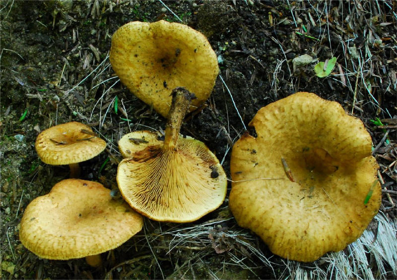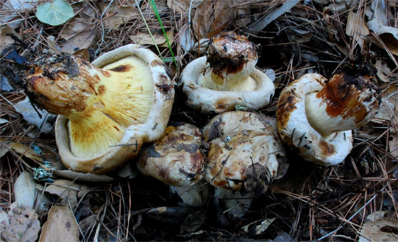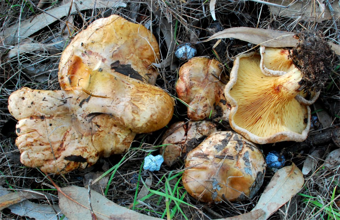 In my neighborhood Paxillus involutus thrives in a solid Eucalyptus grove.