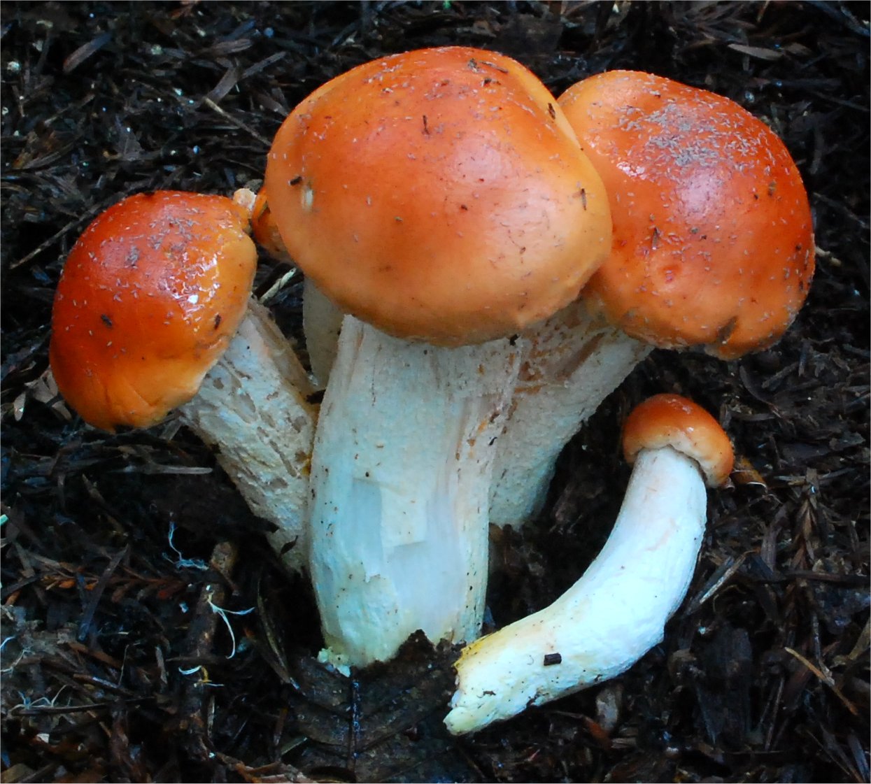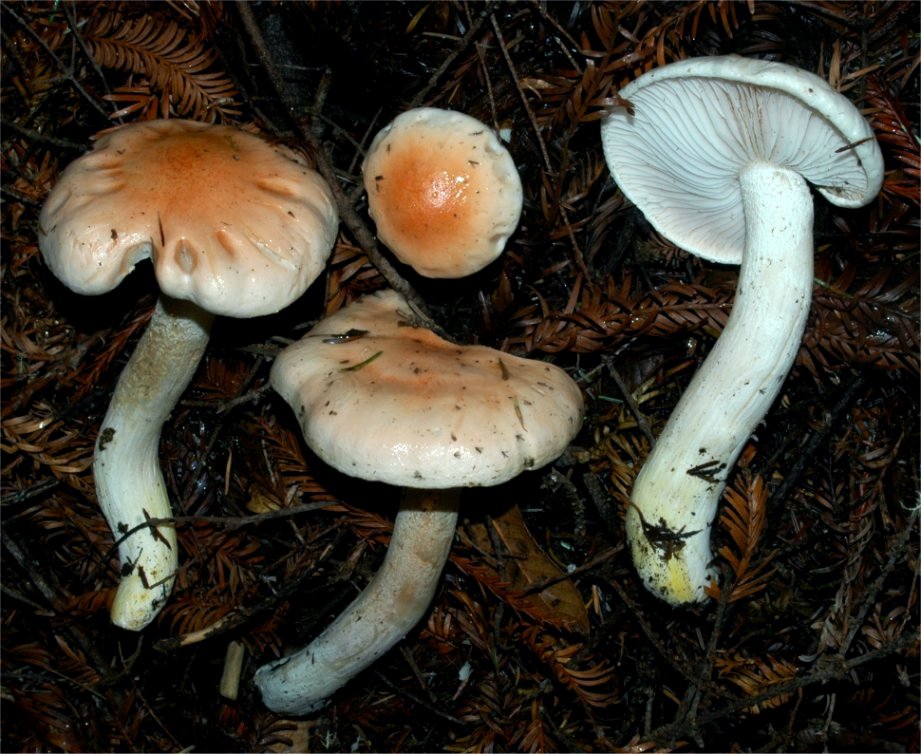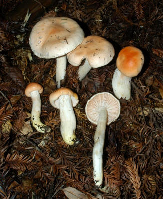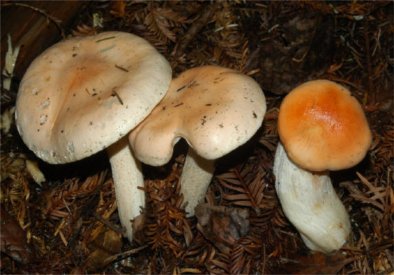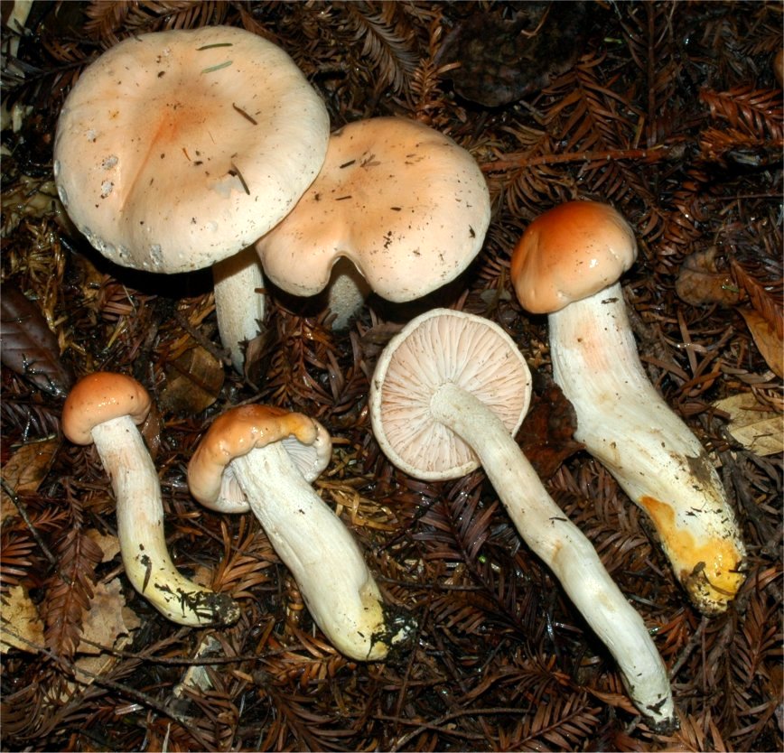 This is the brightly colored North American variety of Hygrophorus pudorinus. Whether the North American material deserves to be a variety of the European pudorinus is something that needs more analysis. An interesting feature of this species is that it turns strongly yellow where bruised. Compare to the original European Hygrophorus pudorinus.