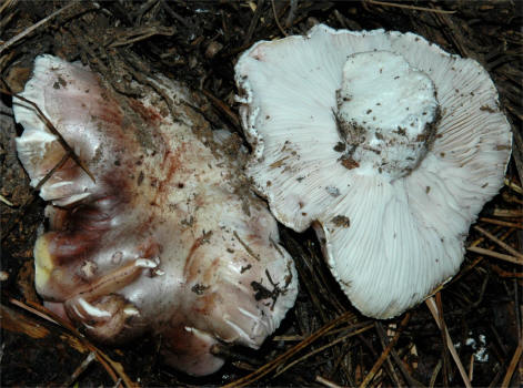 | This is one of the distinctly colored Hygrophori. The colors can vary a great deal in saturation -- from deep purplish to pale to completely white. In California this mushroom fruits both Fall and Spring. In the Spring it is a frequent member of the snowbank mycoflora. I have often wandered whether the autumnal and vernal species are the same as the coloration patterns differ -- the snowbank species tends to be wine to burgundy colored. Compare to Hygrophorus russula. |