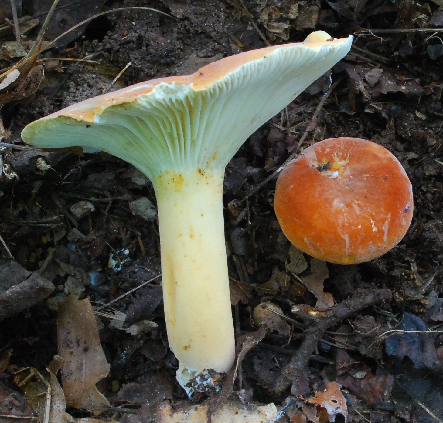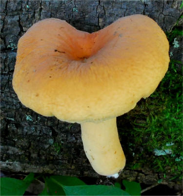 This beautiful milk cap from Eastern North America stands out with its velvety cap and distant gills. It has a white, mild latex.