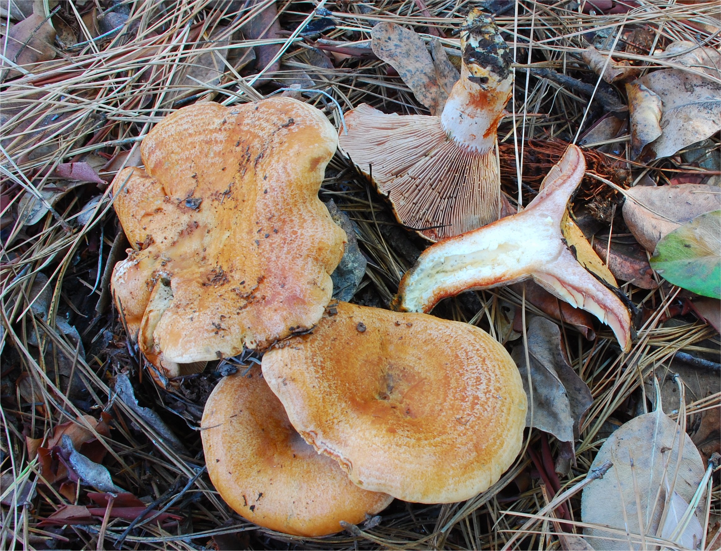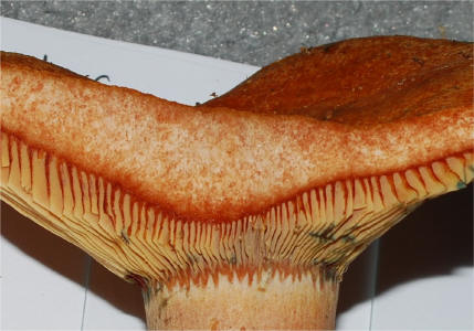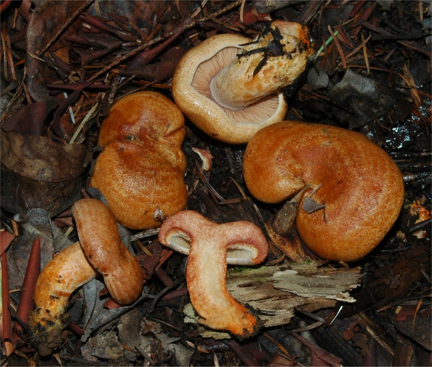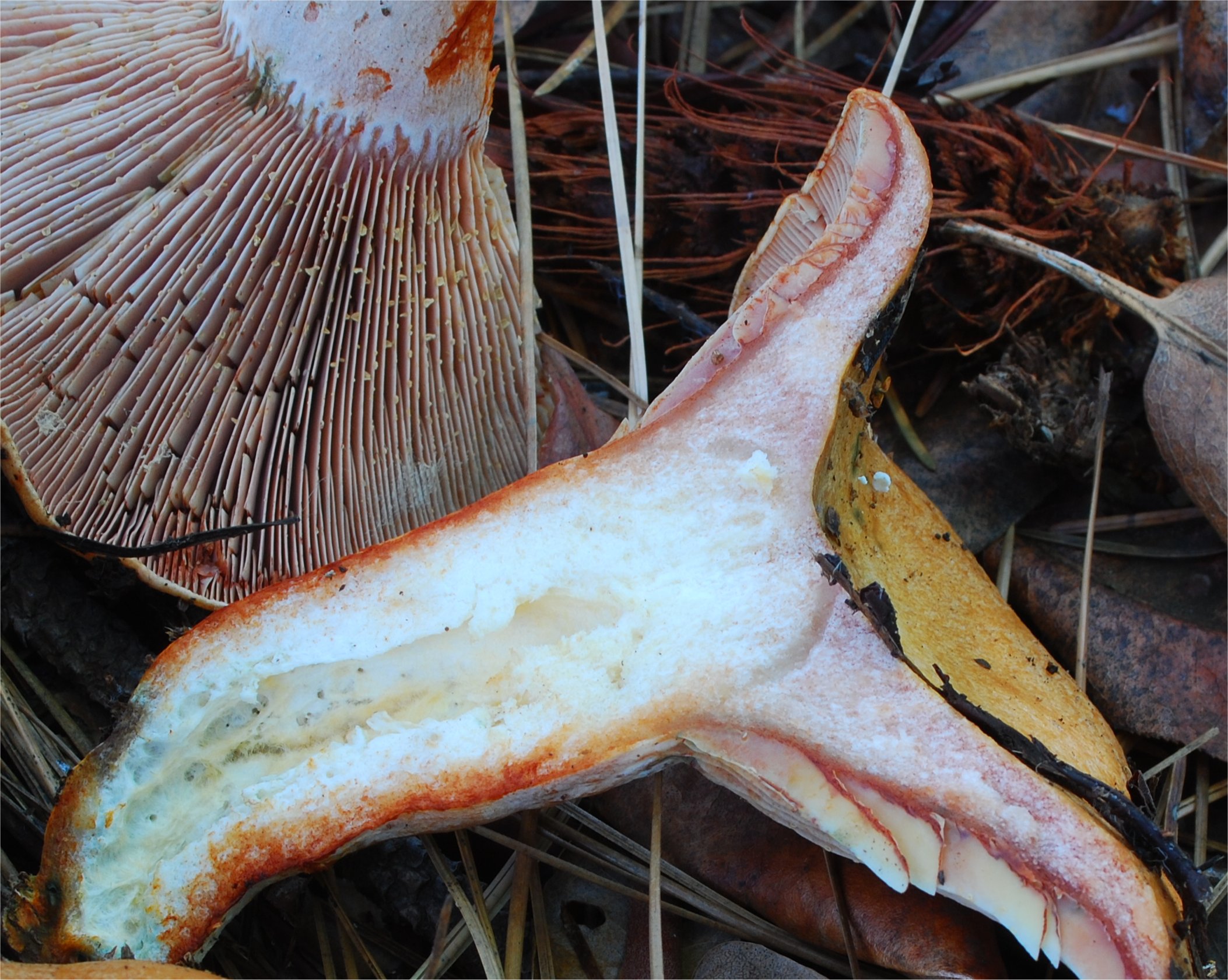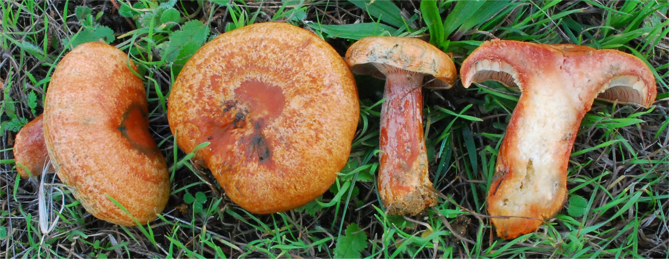 | This species stands out with its strongly red bruising reaction. With its zonate cap and scrobiculate stalk it reminds one somewhat of the European Lactarius deliciosus. |