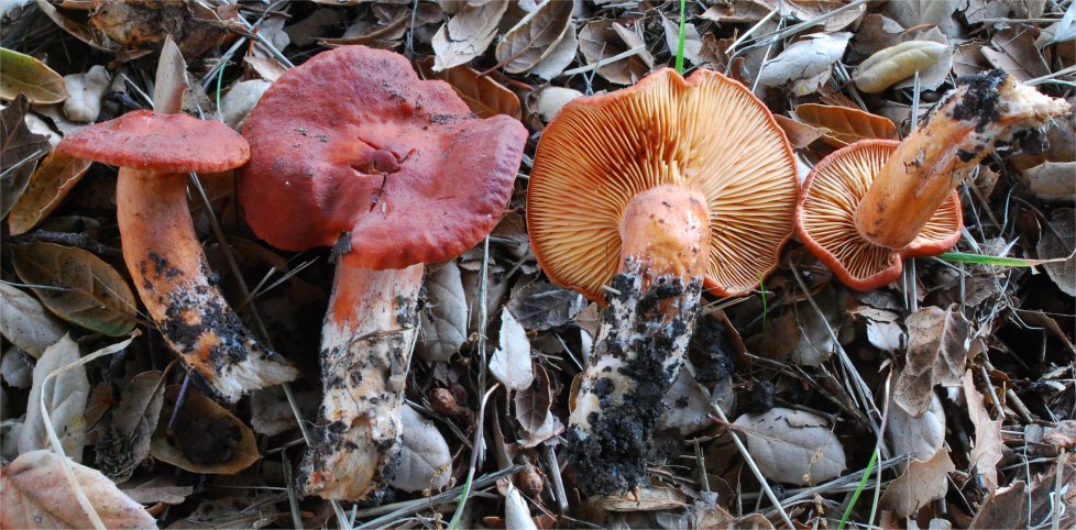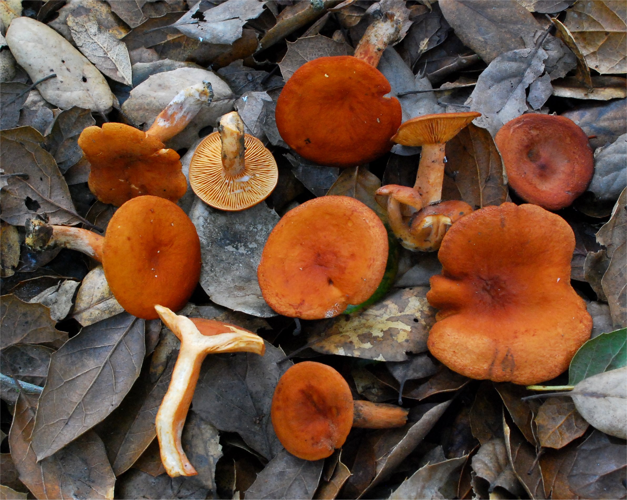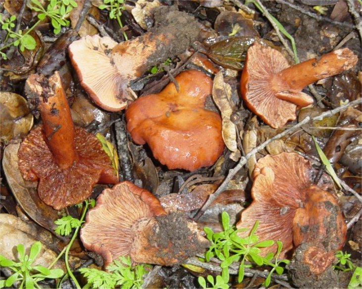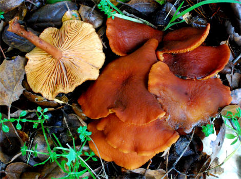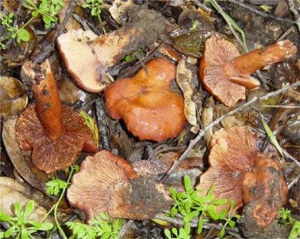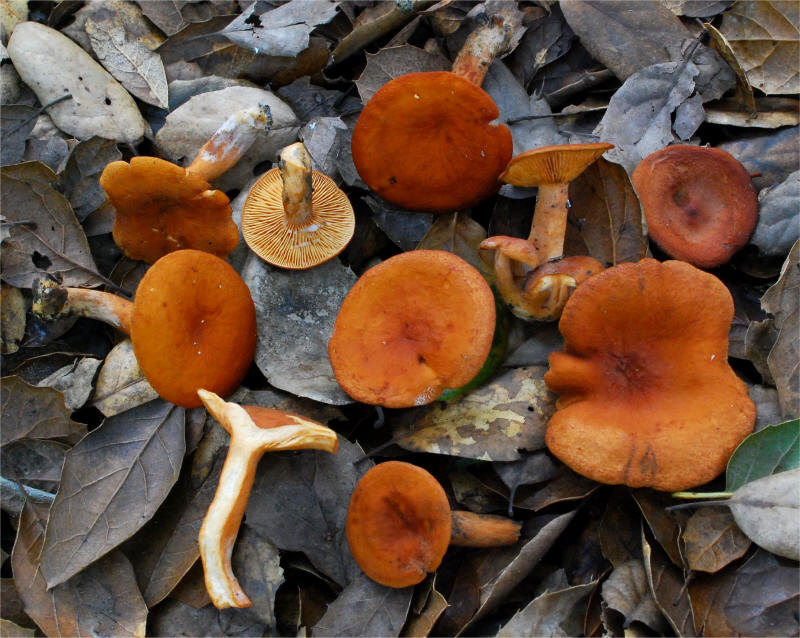 | This species is commonly referred to as the "Large Candy Cap" because it shares somewhat the odor of the regular small "Candy Cap", Lactarius rubidus. Yet the fragrance is less pronounced, more evanescent and also has a slightly different component to it, which one starts to recognize after having examined many fruitbodies. Another easy way to tell them apart is that the stipe of this species can be a lot thicker and mostly solid. This species is very abundant later in the season, but seem to be restricted pretty much to Live Oak (Quercus agrifolia). The near absence of sphaerocysts (verified by me) is a well known microscopic characteristic. Unfortunately, starting with Peck's original description (based on dried material!) there has been a misconception that this species has no odor and the taste is acrid. Subsequent researchers seem to have copied that erroneous line without verifying it. Arora did correctly point out the key characteristic of this species, but still new field guides emerge that have copied that old and erroneous information about the odor and taste. |