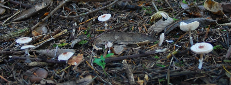 | This is a very common Lepiota in the Mendocino area -- it is member of the cristata/castaneidisca complex, but looks more like Lepiota cristata, except for the cap scales, which do not quite look like it. It has the same distinct odor, spurred spores, but slightly smaller than the typical cristata -- 5-6x2.8-3.5µ. Else Vellinga mentioned of an unnamed cristata -like Lepiota sp. from Mendocino in "Vellinga, E.C., 2001. Studies in Lepiota IV. Lepiota cristata and L. castaneidisca. Mycotaxon 80: 297-306.", but no photograph is available. In the near future will collect many more fruitbodies. |