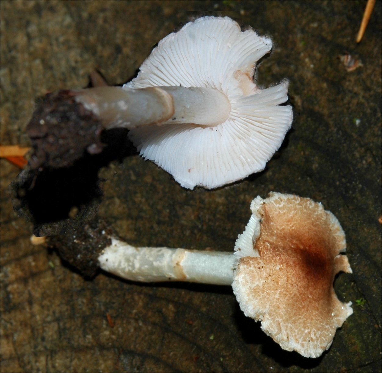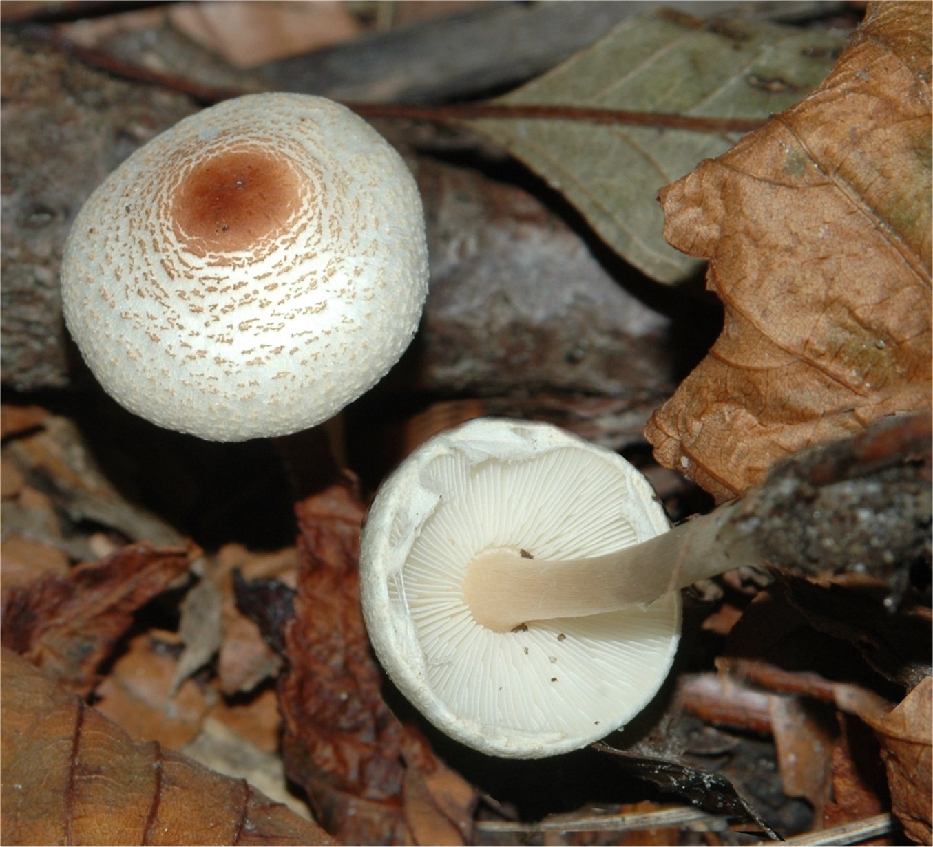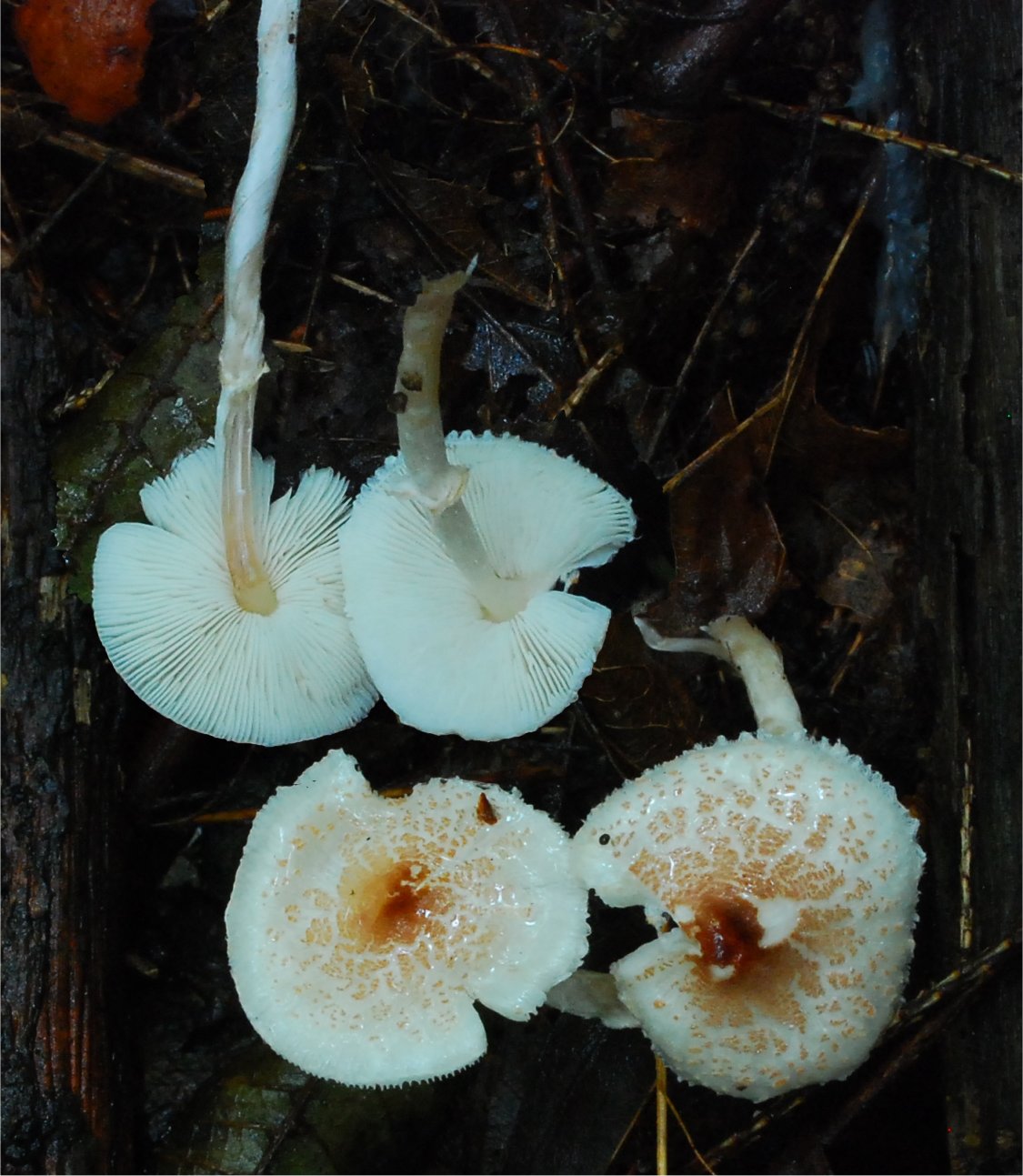 | This is one of the classic little Lepiotas -- it is distinguished by its peculiar odors that is the name sake of the term "cristata-like odor". Microscopically, it's most distinguishing characteristic are the spurred spores. The fruitbodies may have an annulus sticking to the stem, or remaining as an appendiculate margin on the cap. This seems to be a complex of species, which is well represented in the Western North America -- Lepiota castaneidisca and Lepiota DB00047 | ||