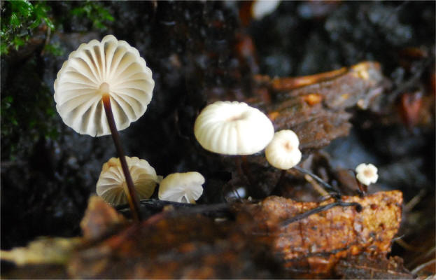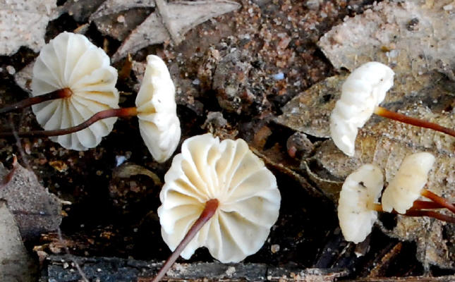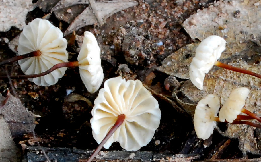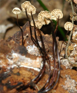 This is one of the classic Marasmius species with the collar separating the gills from the stipe. It typically grows on small twigs and rotting wood. A similar species, but much smaller and not as frequent that grows on leaves is Marasmius bulliardii. neither of these are known from California.