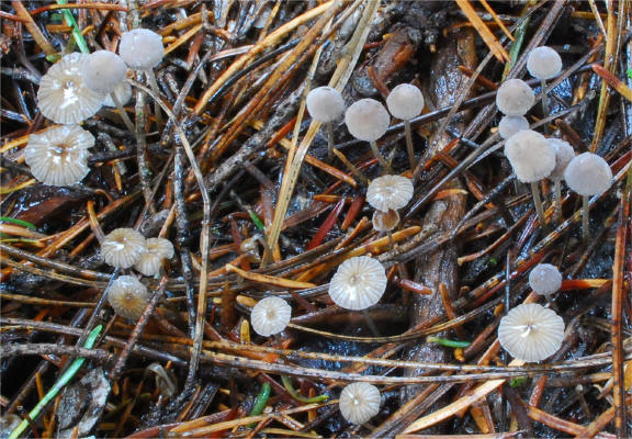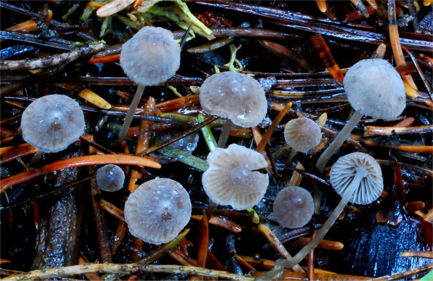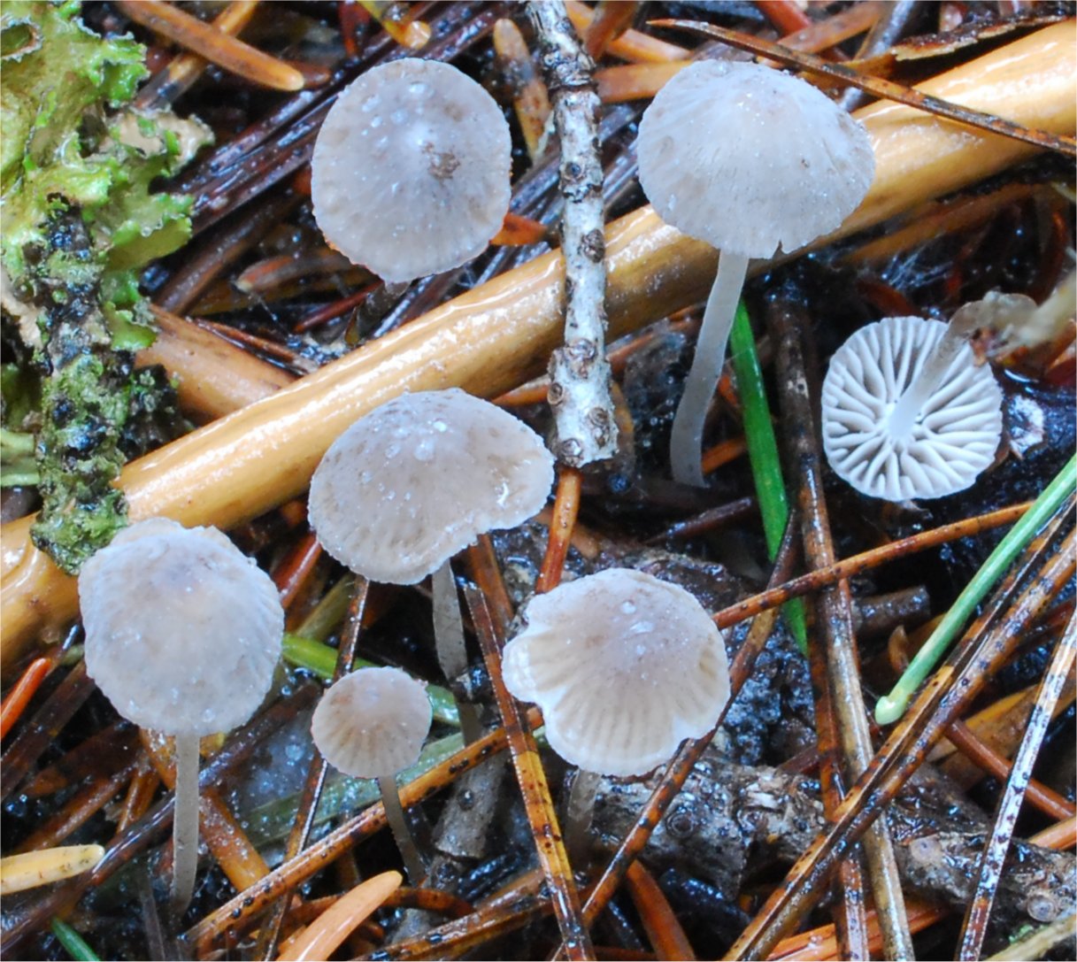![]() Mixed patch of Mycena tenax (viscid) and Mycena cinerella (dry). |