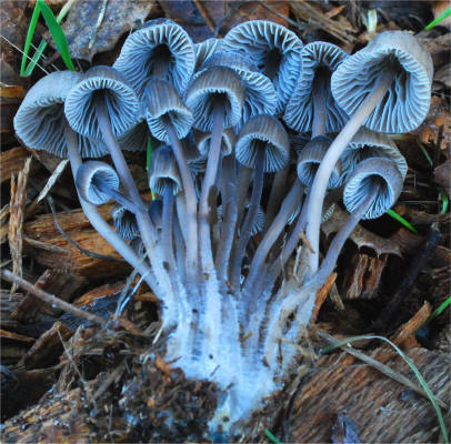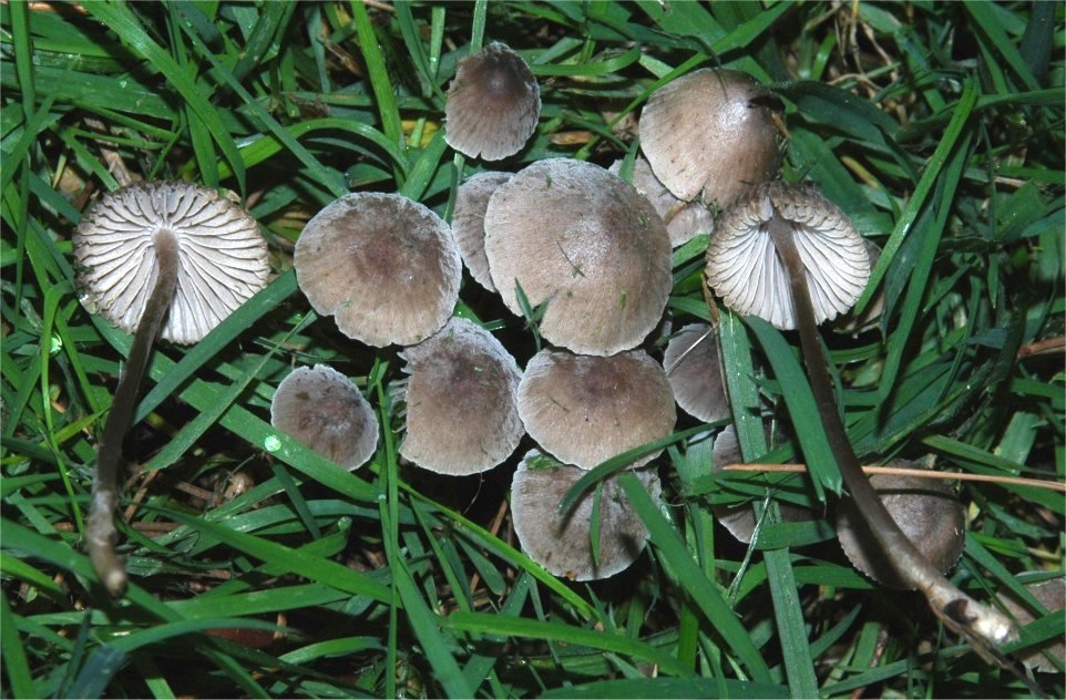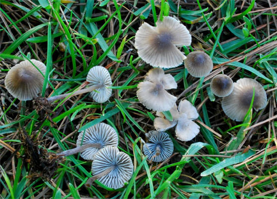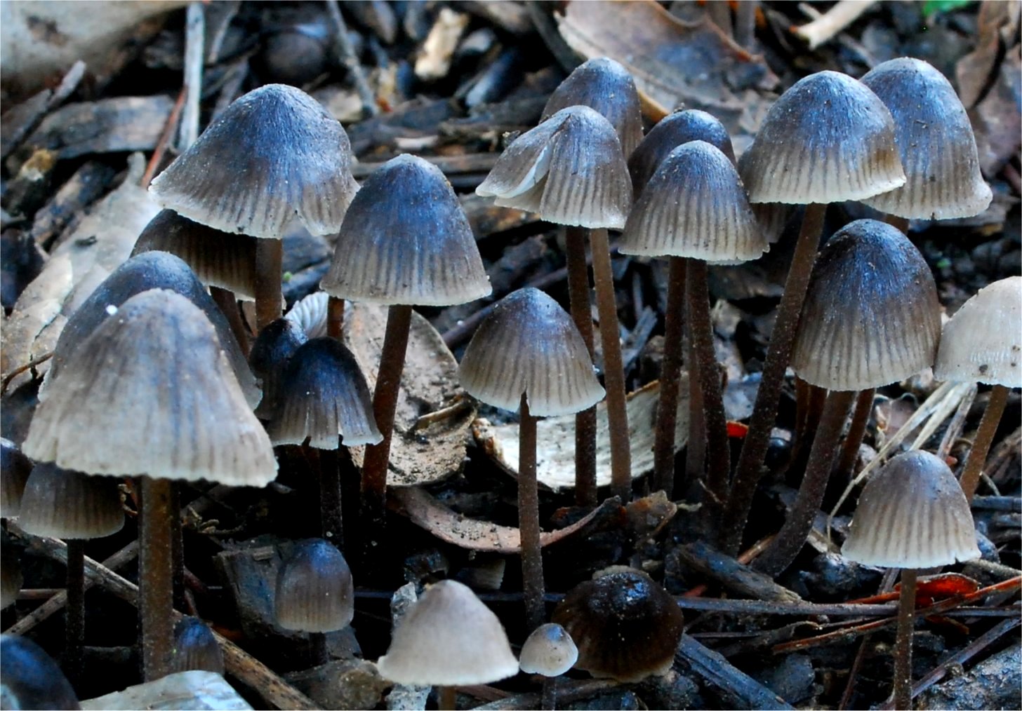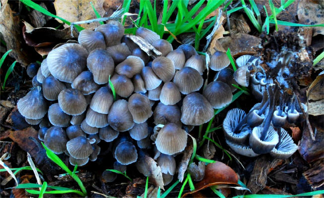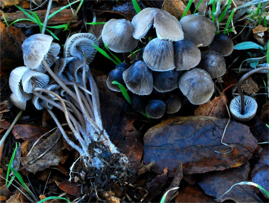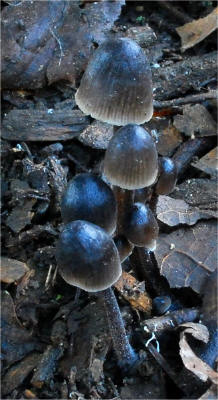 Mycenas. The combination of dark pileus with bloom in dry weather and