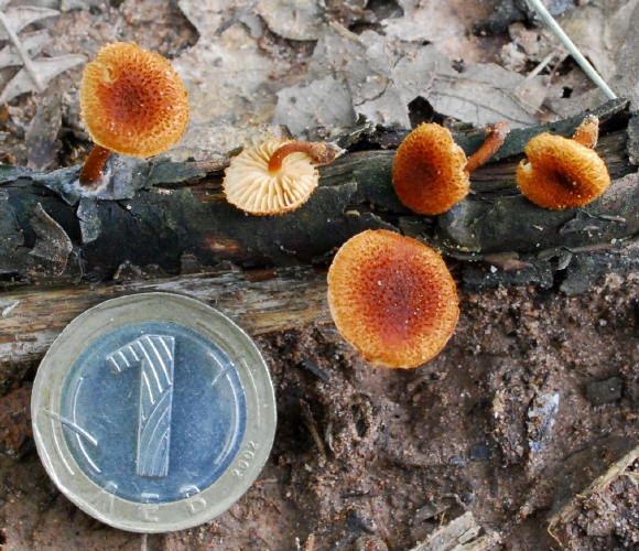 This beautiful little mushroom is fairly common on broadleaved twigs. The fruitings were observed in very dry weather.