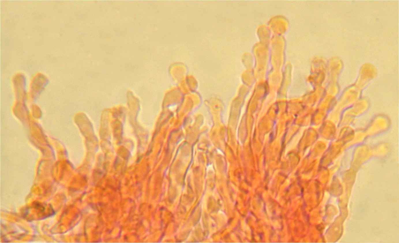 Cheilocystidia forming a sterile band, long flexuous, cylindrical to slightly moniliform,