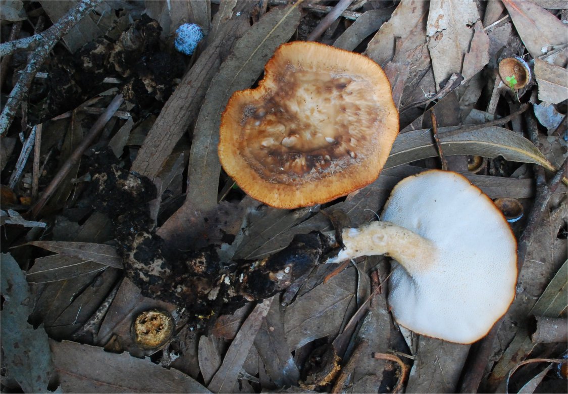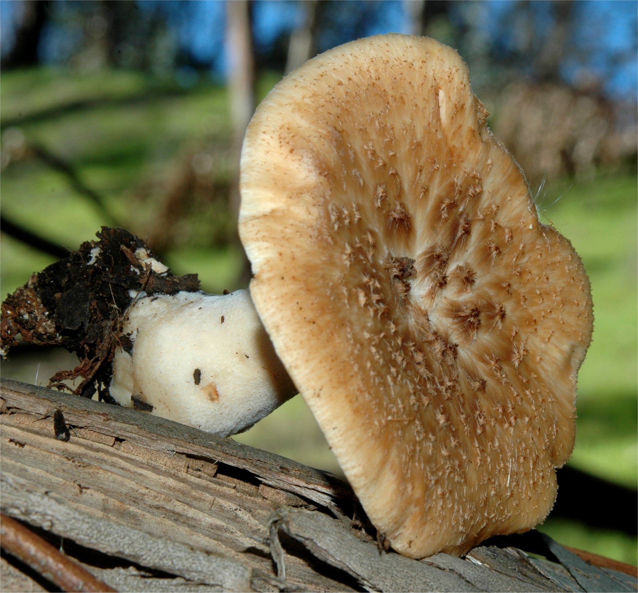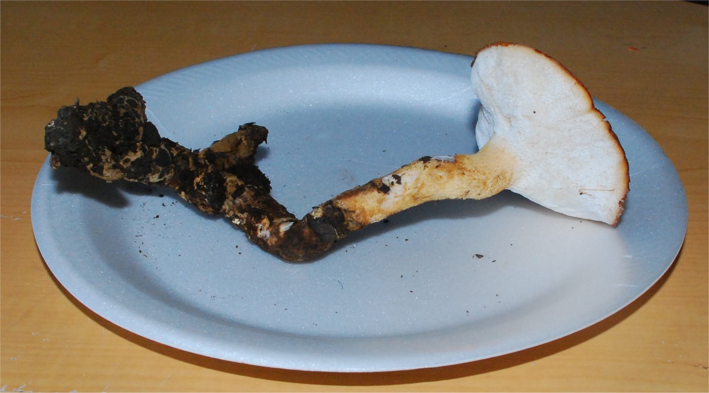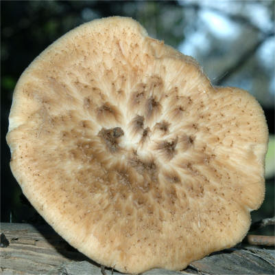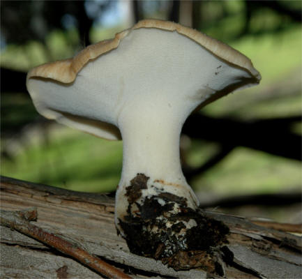 Growing from an underground sclerotium. It can get as big as 50 lbs. The sclerotium n the picture seems to be in a very early formation. For a picture of a well developed sclerotium see Mushrooms Demystified, Color Plate 151.