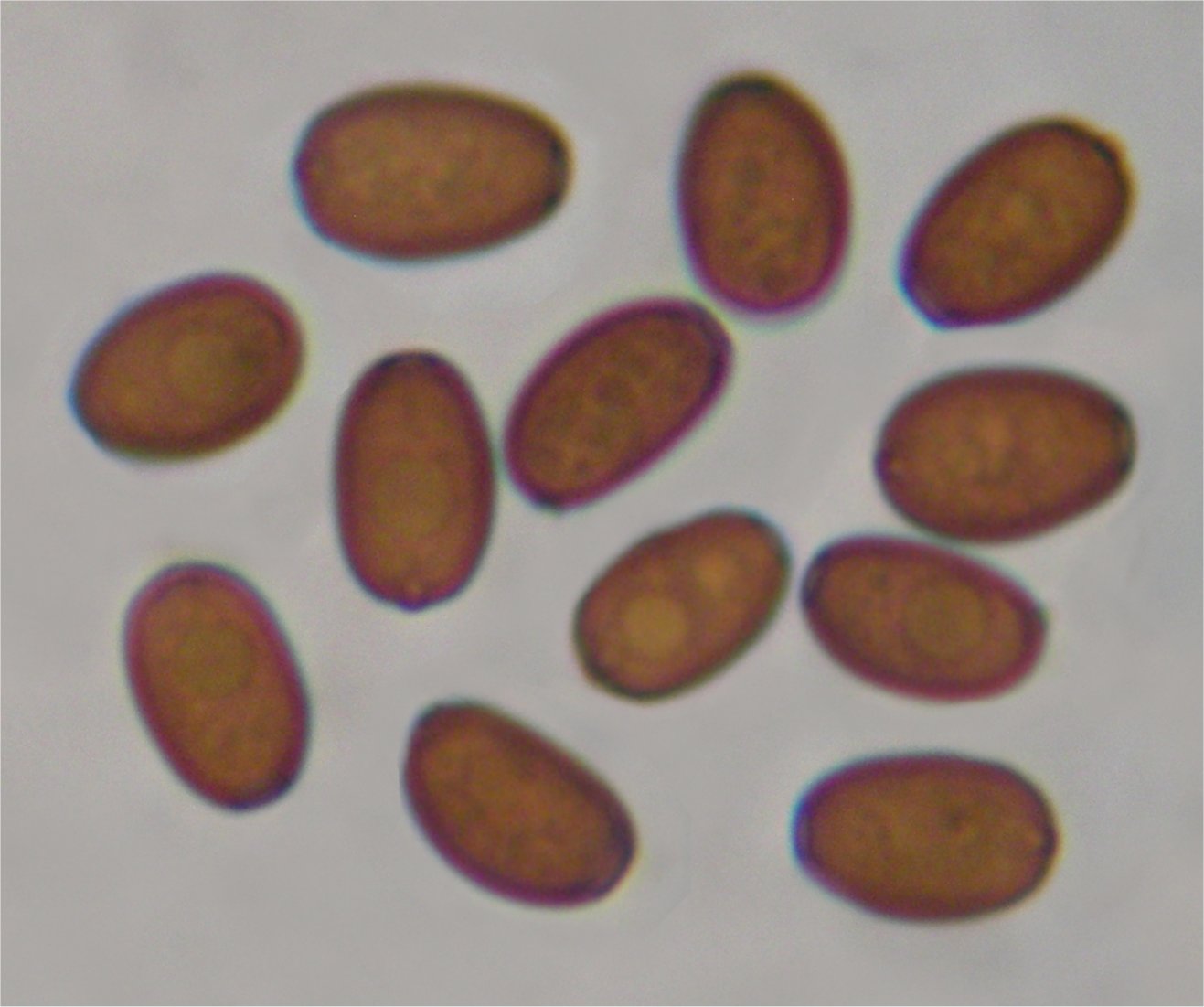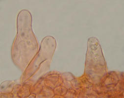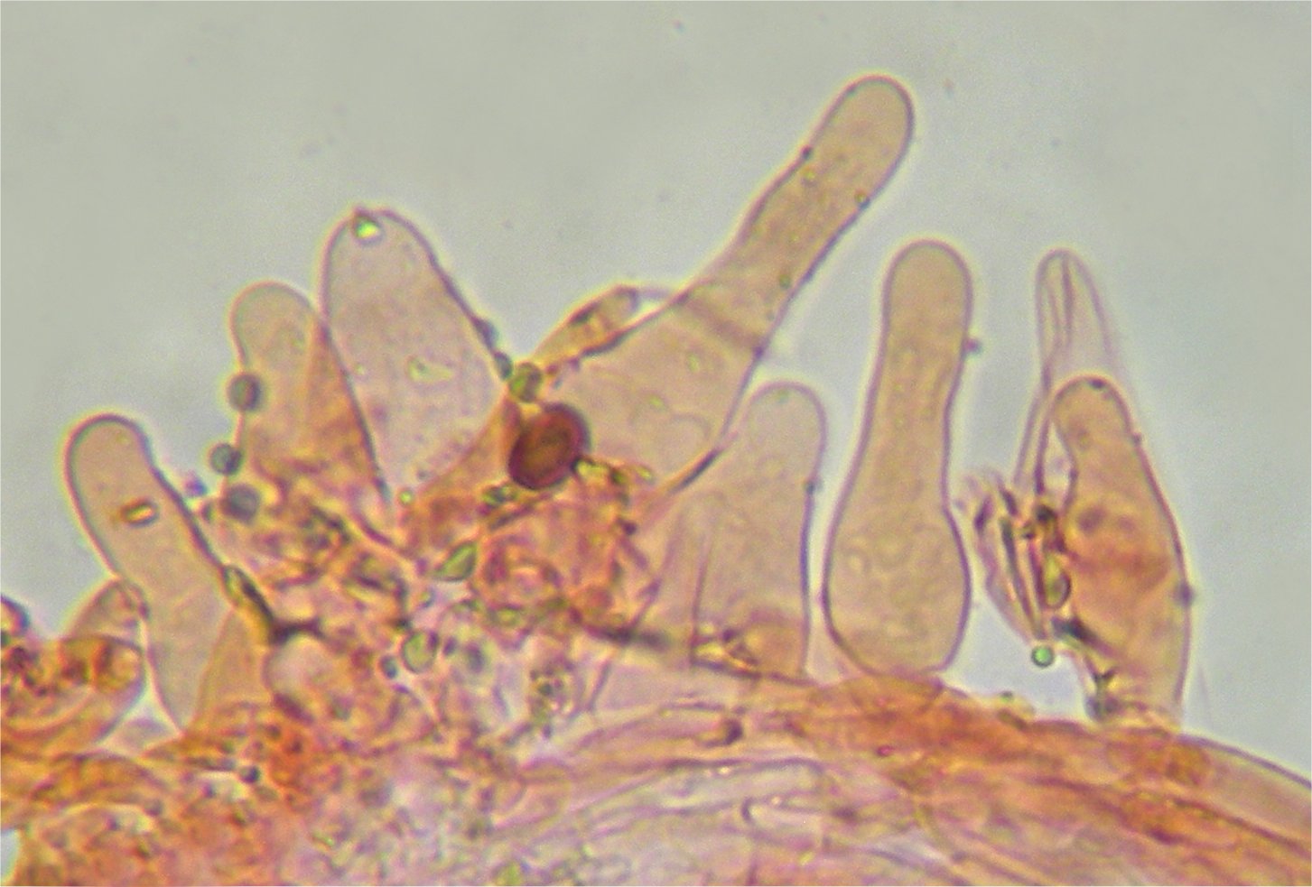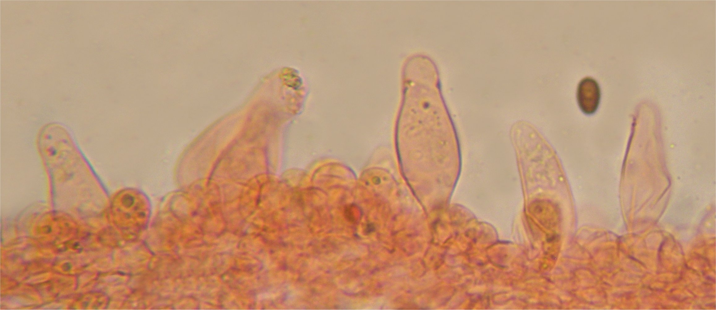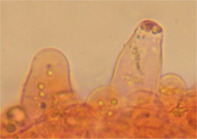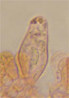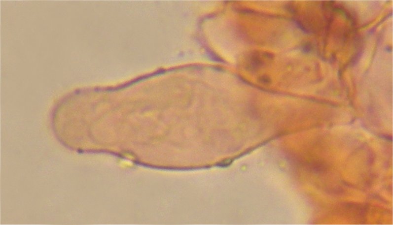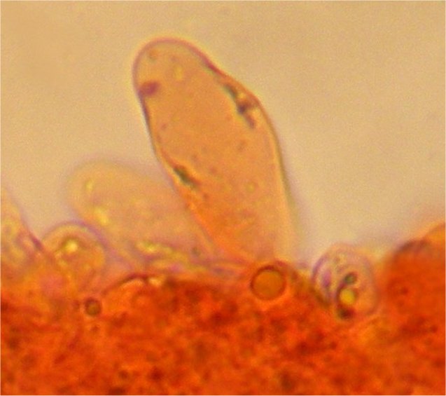 and pleurocystidia, scattered, similar in shape/size, frequently encrusted, often thick walled, 40-54x13-18µ