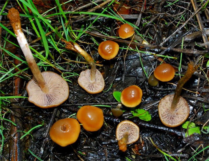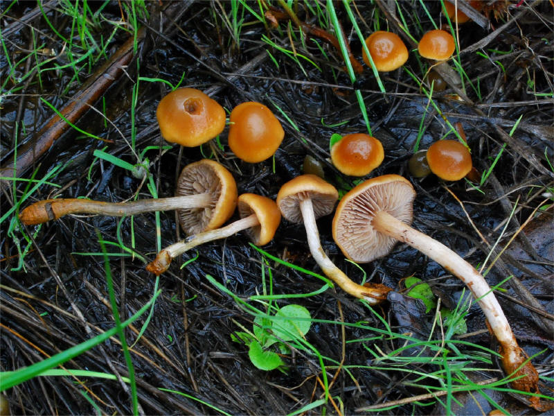 | This species is described primarily as a wet grass dweller -- Stamets remarks that it is hard to pull it without tearing a bunch of grass to come along with it. My observations confirm that impression. Compare to the much similar Psilocybe crobula. | ||
