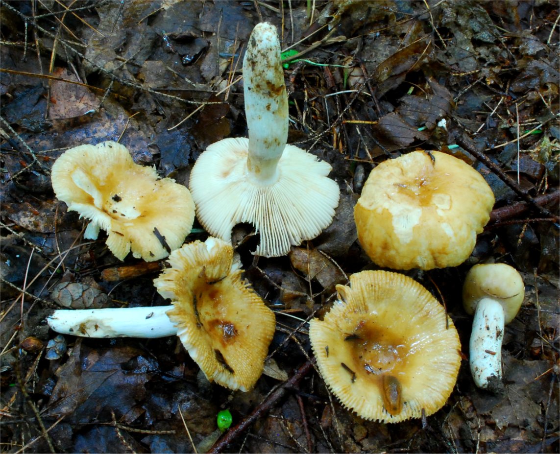 The species Russulas foetens features an  odor, which is as if someone disposed of almond syrup in the sewage pipes and then tried to clean it off with bleach -- it is a combination of all three odors. It can be compared to Russula subfoetens, which is darker colored and has less spiky spores. This species does not seem to occur in California.