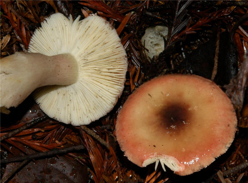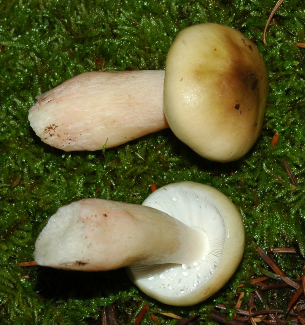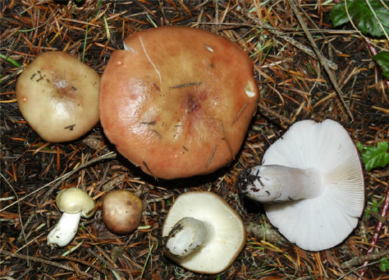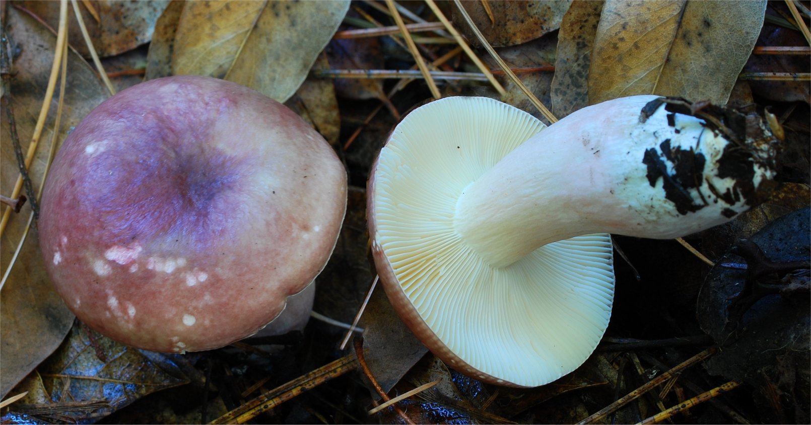 coloration. The cap starts pale-olive and then turns to a purplish-reddish,