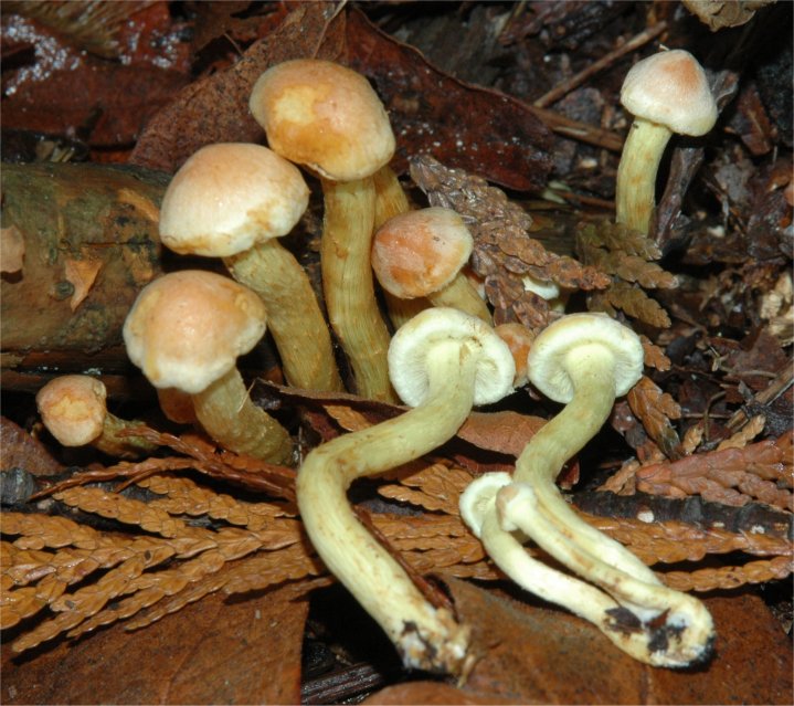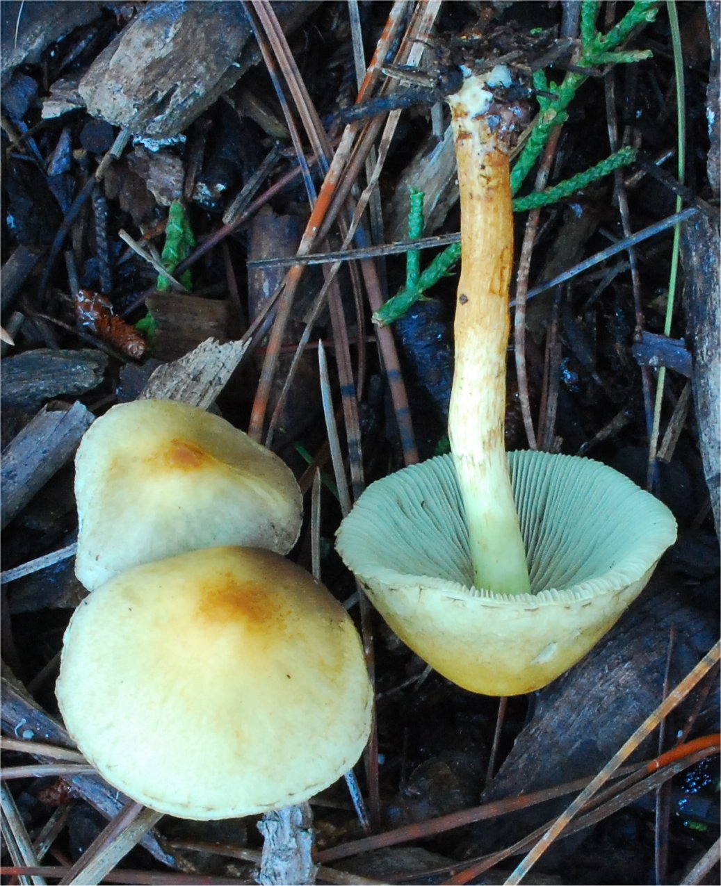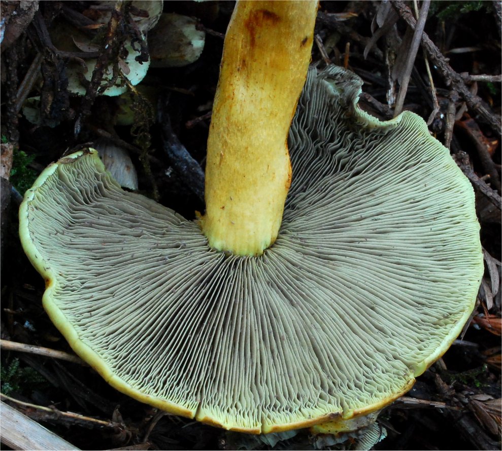 This is one of the most ubiquitous saprophytes in the Northern Hemisphere. It can easily be recognized in the field by the gills with greenish cast. Also, the taste is bitter.
