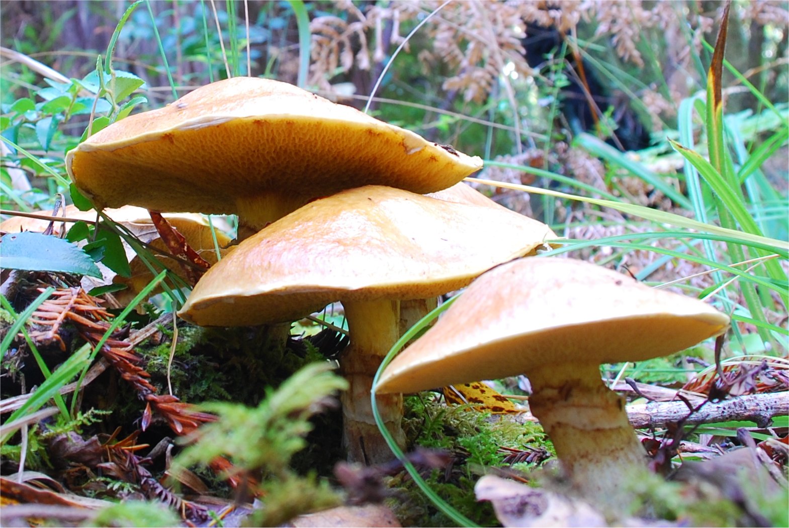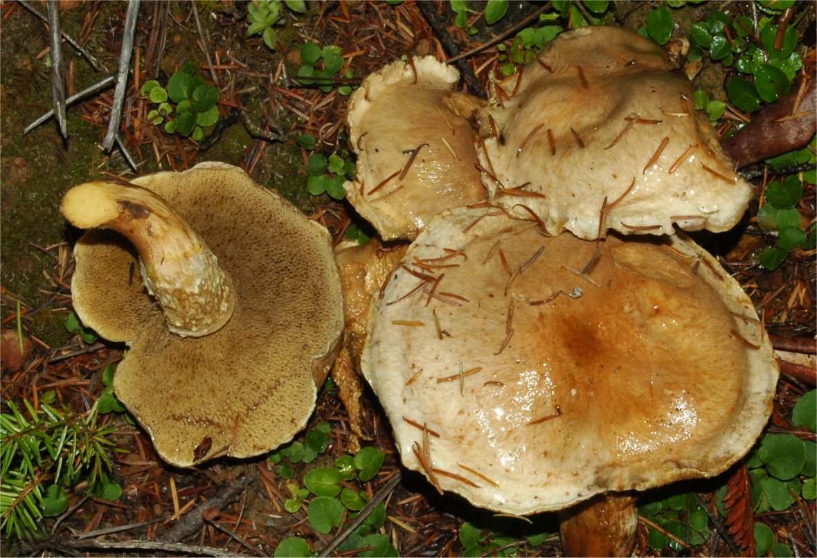 | This species is a staple of the coastal forests of Northern California. It is by far the most abundant Suillus in the area and thought to be associated with Douglas Fir. I see it fruiting from November to as late as June. Similar species, but with a distinct thick, orange belt on the stipe is Suillus ponderosus. | ||