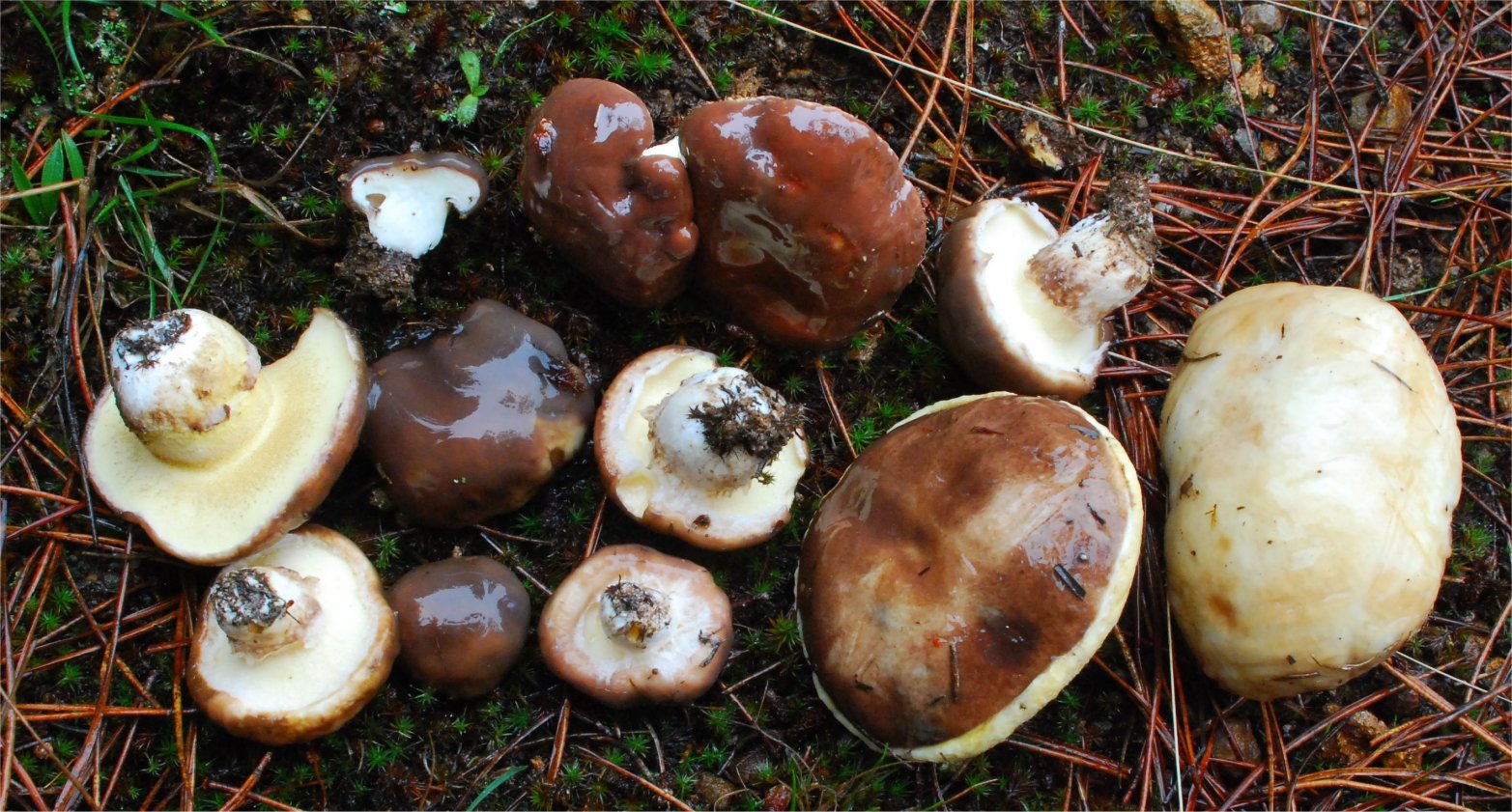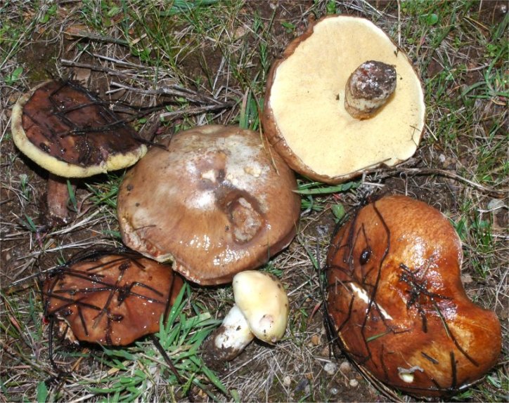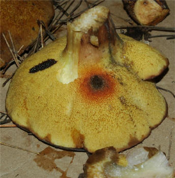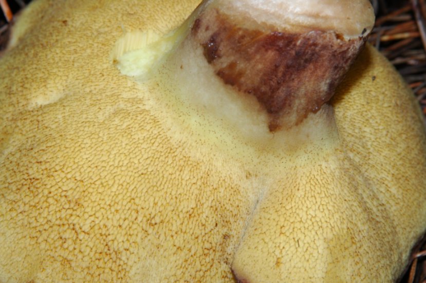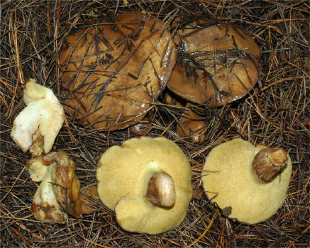 | This one is a somewhat rare Western species that has a similar short stalk as Suillus brevipes, but has a persistent annulus. The coloration of the cap though goes through more stages than the typical brevipes and is far more variable. Originally described from the montane regions under Lodgepole Pine (Pinus contorta), it seems to follow other Sullii in associating to to other Pine species with the same number of needles (2-needles in this case). Locally I see it abundantly in two patches under young Bishop pine (Pinus muricata). |