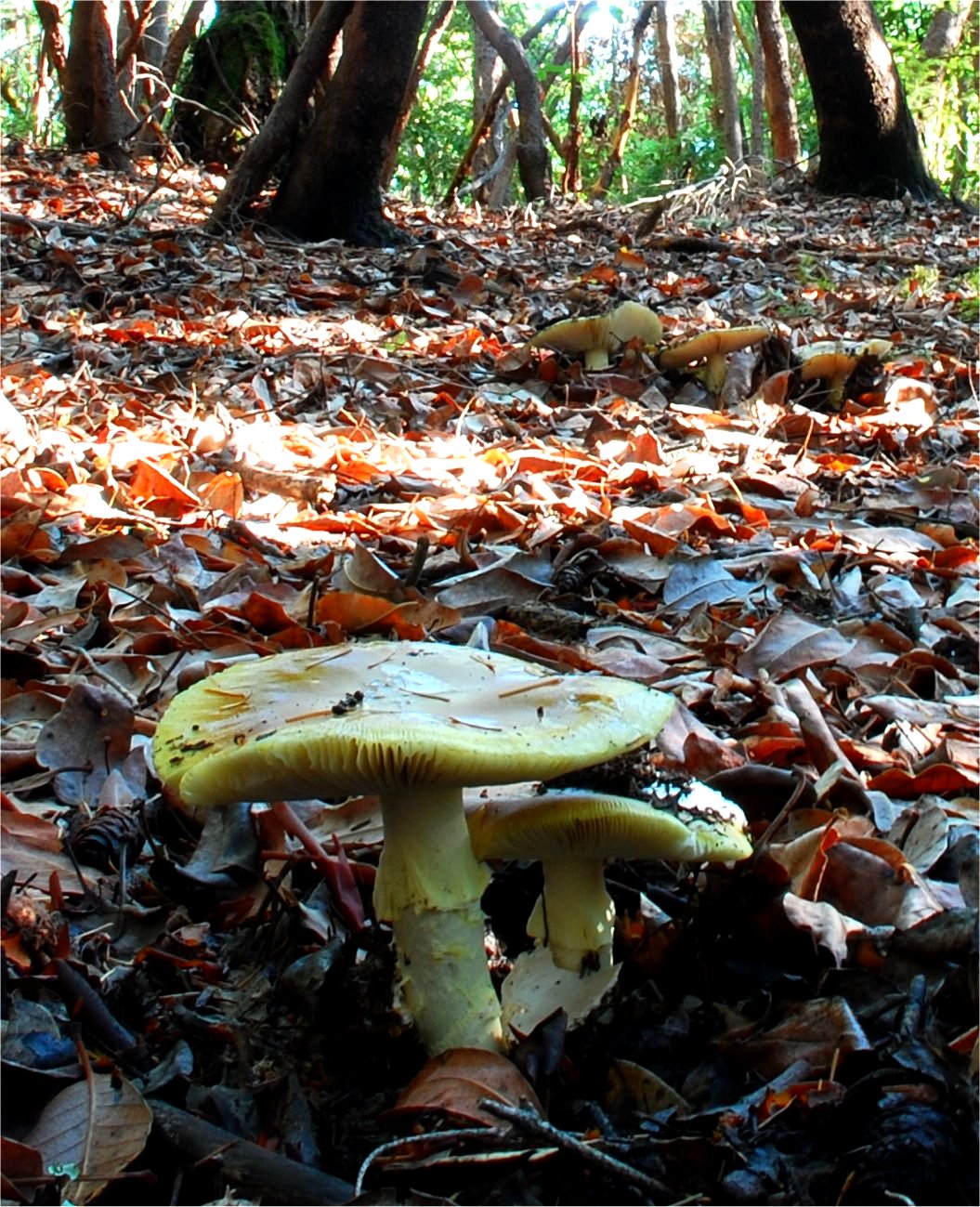 | 5) PHOTOGRAPHING MUSHROOMS IN DIRECT SUNLIGHT OR SHARP SHADOWS. This one is a classic and in the group of highly annoying errors. Everybody has tried to shoot things that are in direct sunlight. The results are awful. The amazing thing is that some people keep doing it over and over again, as if enjoying the poor results. Simple solution is to block the direct sunlight by some means -- photographers in the field can use their body or camera bag for such purposes. Be mindful of using clothing to block the sunlight, as it may let some light go through and usually reflects the color of the garment. A yellow shirt, for example, when used as a sun blocker will give yellow cast to the entire photograph. |