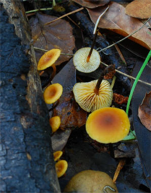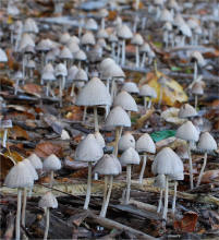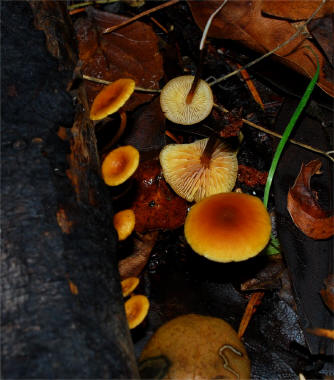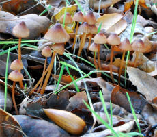 | 12) 'IN SITU' vs. CONTROLLED ENVIRONMENT Darvin DeShazer (SOMA, Sci. Adv.) expressed the view that he likes the type of mushroom photography (Roger Phillips and others) where the collections are treated under controlled lighting and uniform background (affecting white balance). This kind of setup is typically indoor, or definitely away from the field. My view couldn't be more to the contrary of that, as I feel that 'In Situ' photography is far preferable. One concern that I have is that many mushrooms undergo color transformation once they are collected. The effects on the hygrophanous, as well as tiny and perishable species has to be dealt with too. Some mushrooms pale out as can be seen in books with that kind of photography. But this is also a matter of preservation technique apparently, as there are examples of excellent indoor photos. Yet, in general, I find such "controlled photos" lacking life, sterile and uninspiring, more like Lab specimens ("frogs in a jar"). I believe that the Natural habitat of the mushroom not only conveys a lot of analytical information, such as the habitat and location specifics, but also has a better artistic components. By setting certain mood, it allows us to enjoy the surrounding environment, which is a major reason for why we go out at the first place. It also helps us set mental notes on where we can find such mushrooms. | ||||||